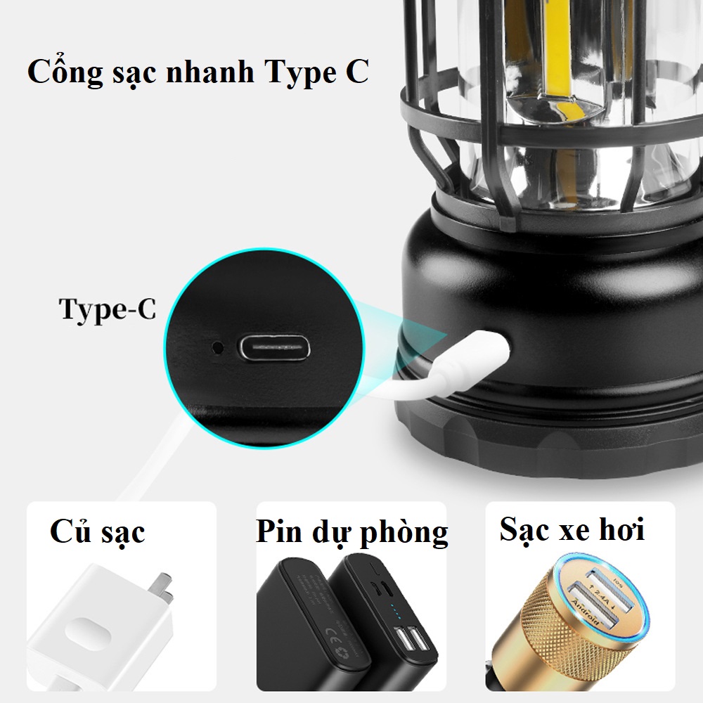 Đèn cắm trại, đèn bão camping, du lịch dã ngoại, treo lều retro, Dùng pin sạc USB tích điện 18650mAh
