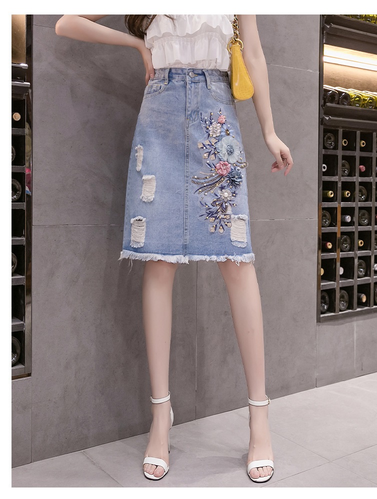 - Chân váy jean ngang gối đính hoa 09, Chân váy thiết kế cao cấp, vải jean dày C020