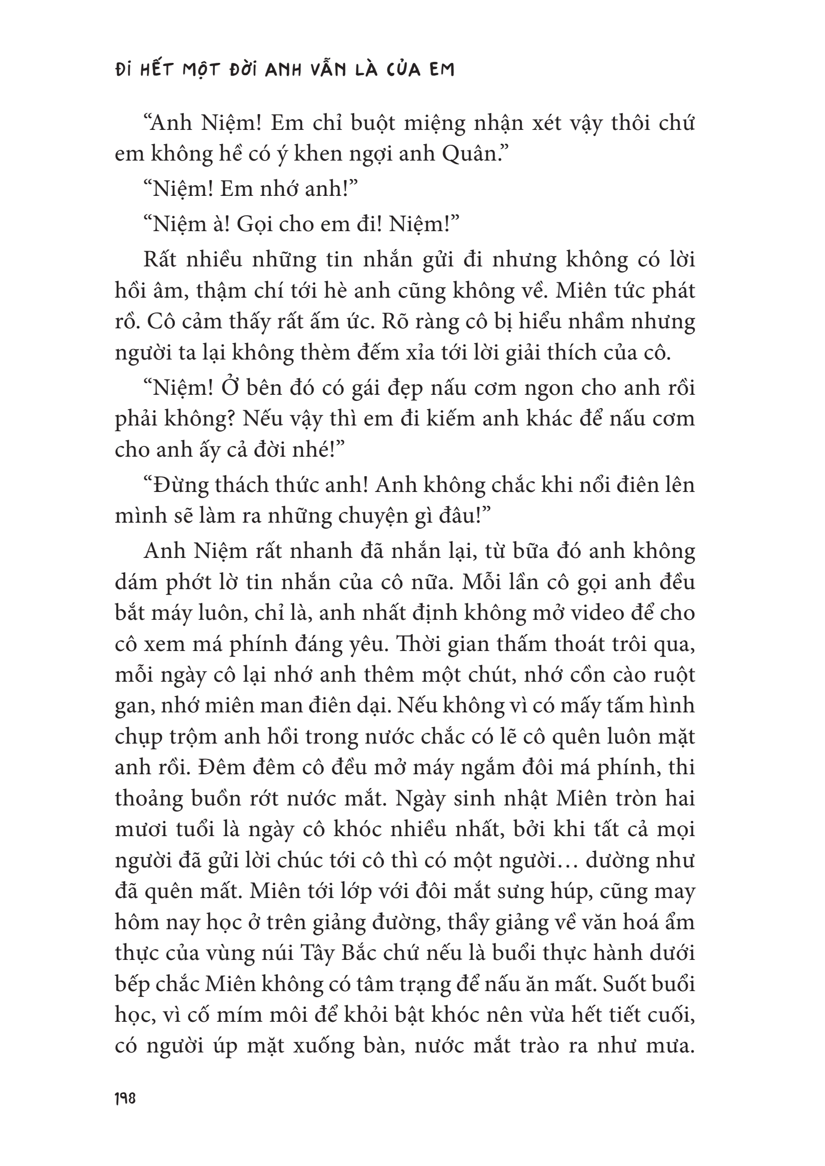 Đọc "Đi hết một đời anh vẫn là của em" để thấy hình ảnh của mình trong Miên và Niệm những ngày thanh xuân bên nhau, cả khi cuộc tình chênh vênh nổi gió, để được chữa lành trái tim nhiều vết xước, thương tổn bởi sự ấm áp của mối tình mang tên "một đời - một kiếp".