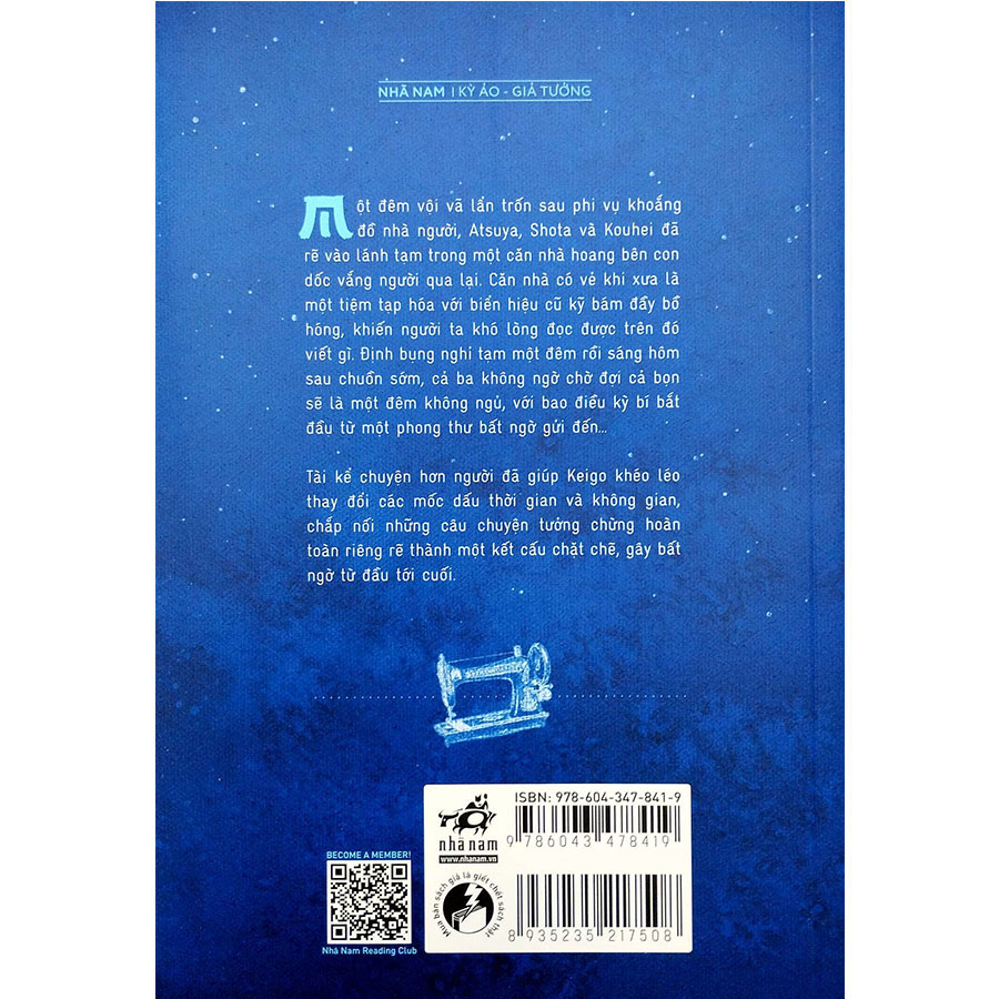 Một đêm vội vã lẩn trốn sau phi vụ khoắng đồ nhà người, Atsuya, Shota và Kouhei đã rẽ vào lánh tạm trong một căn nhà hoang bên con dốc vắng người qua lại. Căn nhà có vẻ khi xưa là một tiệm tạp hóa với biển hiệu cũ kỹ bám đầy bồ hóng, khiến người ta khó lòng đọc được trên đó viết gì. Định bụng nghỉ tạm một đêm rồi sáng hôm sau chuồn sớm, cả ba không ngờ chờ đợi cả bọn sẽ là một đêm không ngủ, với bao điều kỳ bí bắt đầu từ một phong thư bất ngờ gửi đến…