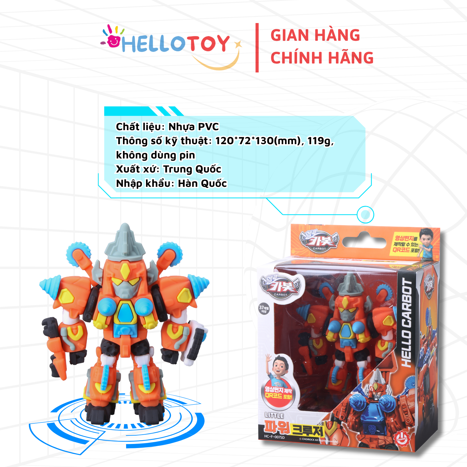 - Thông tin bổ sung:Hình ảnh và văn bản chỉ đề cập đến tên sản phẩm là "CHOIROCK - Đồ chơi Robot Little Power Crewzer". Không có thêm thông tin về mô tả, chất liệu hoặc tính năng. Lưu ý: Tất cả thông tin được cung cấp đều dựa trên dữ liệu sản phẩm đã cho, không có giả định hoặc mô tả chủ quan ngoài thông tin đó. 1.Tên sản phẩm: Đồ chơi trẻ em 2.Tên hàng hóa: [HELLO CARBOT] LITTLE POWER CREWZER 3.Mã hàng hóa:HC-F-007SD 4.Thành phần: Nhựa PVC 5.Thông số kỹ thuật: 12072130 (mm), 136g, không dùng pin 6.Tuổi sử dụng: Trên 37 tháng 7.Hướng dẫn sử dụng: chơi và trưng bày 8.Cảnh báo: Không thích hợp cho trẻ em dưới 37 tháng, có các chi tiết nhỏ!