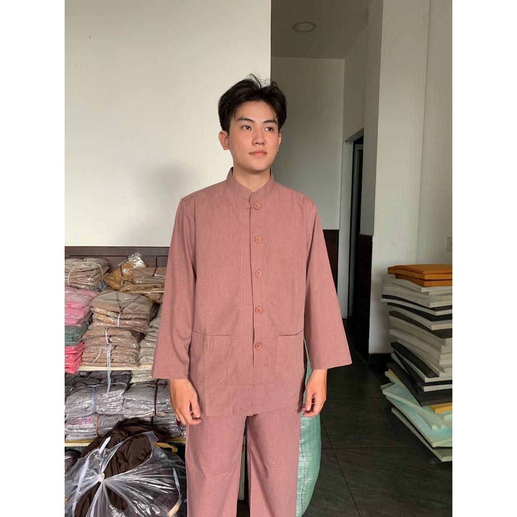 Quần áo cư sĩ nam - đồ lam đi chùa Phật tử nam - pháp phục Sen Hồng
