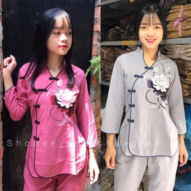 [ FREE SHIP ] Bộ đồ lam đi chùa nữ thêu sen chất liệu đũi thái, Pháp phục lễ chùa cổ tàu phối