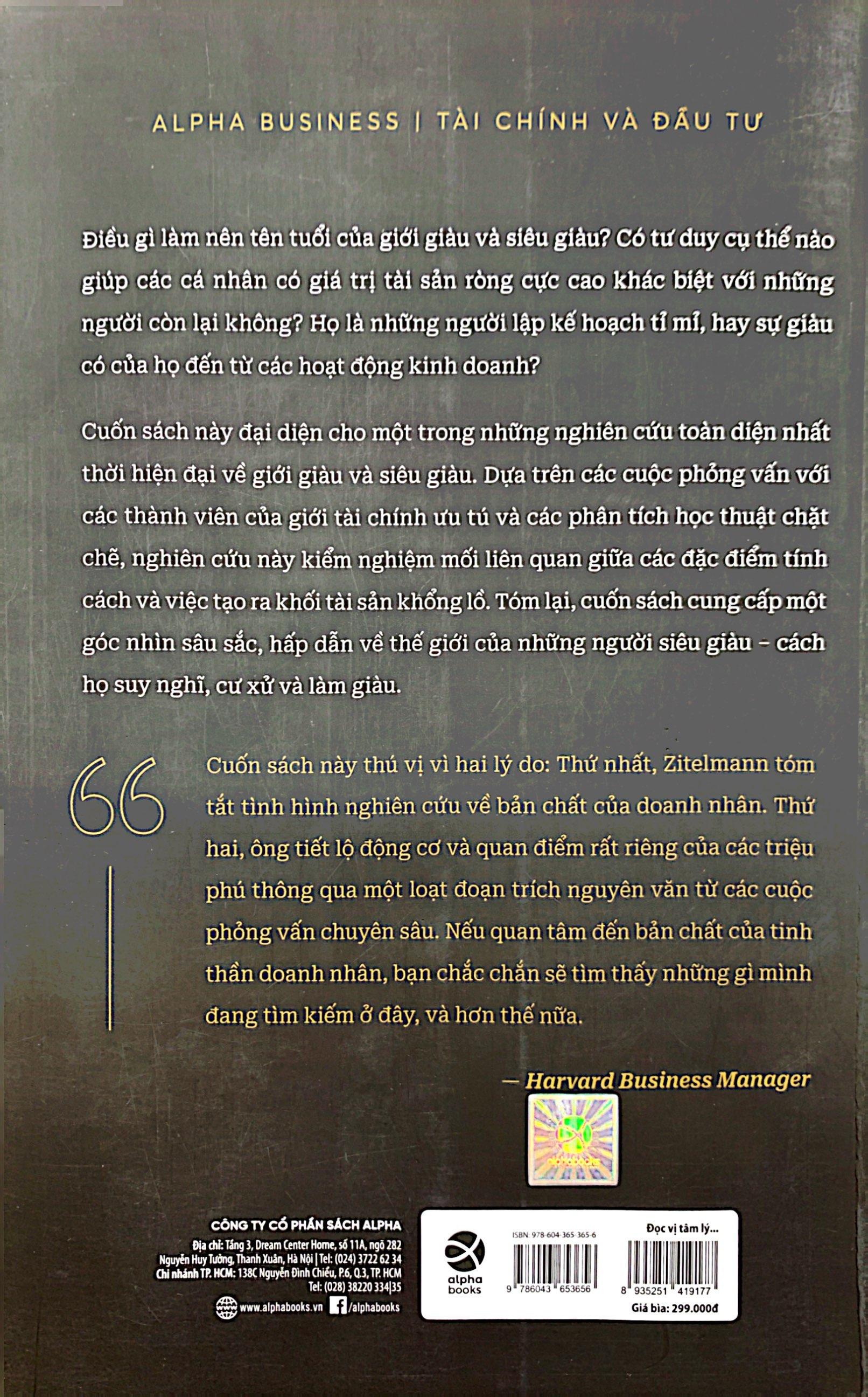 Cuốn sách nhằm mục đích lấp đầy những khoảng trống trong nghiên cứu về sự giàu có, mối tương quan giữa các đặc điểm tính cách cụ thể và sự thành công của doanh nhân. Tác giả đã thực hiện 45 cuộc phỏng vấn với những cá nhân có giá trị tài sản ròng từ 10 triệu đến 30 triệu EUR ở nhóm thấp nhất, lên đến hàng trăm triệu, thậm chí vài tỉ EUR ở nhóm cao nhất. Phần A của cuốn sách, trong đó trình bày chi tiết tình hình nghiên cứu học thuật hiện nay trong lĩnh vực này, sẽ giúp người đọc hiểu được cách xây dựng các câu hỏi cho cuộc phỏng vấn. Phần này vạch ra những khoảng trống đang tồn tại trong việc nghiên cứu, xây dựng các câu hỏi và mô tả phương pháp nghiên cứu. Chương 1 bàn tới thực trạng nghiên cứu học thuật về sự giàu có, tổng hợp lại những phát hiện quan trọng nhất và vạch ra những lỗ hổng trong nghiên cứu. Chương 2 đánh giá cách sử dụng và định nghĩa của thuật ngữ "giới tinh hoa kinh tế" trong nhiều nghiên cứu về giới tinh hoa. Những nghiên cứu trước đây về giới tinh hoa kinh tế đã quá chú trọng vào các thành viên điều hành được tuyển dụng vào các vị trí lãnh đạo trong khi gần như hoàn toàn bỏ qua các doanh nhân độc lập và các nhà đầu tư. Có những lí do chính đáng để chia tầng lớp tinh hoa kinh tế thành hai nhóm. Chính những người giàu có kiệt xuất, một phân nhóm riêng biệt trong giới tinh hoa kinh tế, là chủ đề của tác phẩm này. Chương 3 mô tả thực trạng của nghiên cứu tinh thần doanh chủ. Ngay từ đầu thế kỉ XX, các tác giả khám phá hiện tượng khởi nghiệp, nổi bật nhất là Werner Sombart và Joseph Schumpeter, đã nhấn mạnh tầm quan trọng của các vấn đề tâm lý. Ngày nay, các nghiên cứu về tâm lý của doanh nhân, đặc biệt là ở Hoa Kỳ, rất đa dạng và sẽ được thảo luận trong mục 3.2. Phần này tập trung vào những phát hiện quan trọng của nghiên cứu về tính cách các doanh nhân. Chương 4 đề cập đến kinh tế học hành vi và các thuyết học tập, trong chừng mực chúng có liên quan đến thành công của doanh nhân. Chúng bao gồm cả học tập "chủ động" và "vô thức". Học tập vô thức, nền tảng của "tri thức ẩn", đóng một vai trò đặc biệt quan trọng đối với các doanh nhân, như các nghiên cứu hiện nay đã chỉ ra và điều đó cũng được khẳng định rõ ràng qua cuộc phỏng vấn với các UHNWI được trình bày trong cuốn sách này. Chương 5 xem xét vai trò của cơ hội hoặc "may rủi". Cả hai yếu tố này thường được các cá nhân thành công đề cập đến, và có những nghiên cứu cho rằng chúng có vai trò lớn hơn nhiều so với thực tế thấy được từ cuốn sách này. Liệu có những nguyên nhân nào về mặt xã hội và tâm lý để lí giải việc những người thành công thường nhấn mạnh vào may rủi hay cơ hội? Chương 6 xem xét các lí thuyết về tính cách, đặc biệt tập trung vào những đặc điểm tính cách theo thuyết Năm Nhân tố. Chương này cũng thảo luận về lí do vì sao trong các cuộc phỏng vấn, tác giả lại khám phá những đặc điểm khác ngoài những đặc điểm mà lí thuyết Năm Nhân tố đã xác định, chẳng hạn như xu hướng rủi ro. Chương 7 tập trung vào phương pháp luận. Đầu tiên, chương này cung cấp một cái nhìn tổng quan về các phương pháp tiếp cận có thể có đối với phỏng vấn định tính, tiếp theo là giải thích về việc lựa chọn phỏng vấn có định hướng làm mô hình phù hợp nhất cho nghiên cứu này. Ngoài ra, vấn đề về khuynh hướng phản ứng theo mong đợi của xã hội như đã đề cập ở trên, thường được đánh giá thấp trong các nghiên cứu về doanh nhân và giới tinh hoa, cũng sẽ được thảo luận cụ thể. Cuối cùng, Phần B đưa ra đánh giá về 45 cuộc phỏng vấn với các UHNWI. Nội dung bao quát này được sắp xếp theo chủ đề. Các câu trả lời nguyên văn của đối tượng phỏng vấn được trình bày đầy đủ, bởi vì một trong những mục tiêu chính của nghiên cứu này là truyền tải lại nguyên vẹn quan điểm của những đối tượng phỏng vấn, đồng thời có được cái nhìn chân thực nhất có thể về cách tư duy và khuôn mẫu hành vi của họ. ĐÁNH GIÁ VỀ CUỐN SÁCH Thông tin/ Đánh giá về bản gốc: hiệu ứng truyền thông, tầm ảnh hưởng của cuốn sách, giá trị mang lại/ độ phù hợp độc giả Việt Trích đánh giá của chuyên gia, tổ chức uy tín về cuốn sách "Rainer Zitelmann làm được điều gần như chưa nhà nghiên cứu nào trước ông có thể: Luận án tiến sĩ của ông hé lộ những bí mật về giới siêu giàu ở Đức, khám phá thế giới vốn chưa từng được công chúng biết đến của những triệu phú và triệu triệu phú. Zitelmann đã thực hiện các cuộc phỏng vấn chuyên sâu với 45 triệu phú và tỉ phú… và thật vô cùng thú vị khi được đọc về cách cha mẹ họ đối phó với chủ đề tiền bạc” - Tạp chí FOCUS MONEY-Online “Cuốn sách của Zitelmann có tầm quan trọng lớn vì nó cung cấp lời giải thích cho sự thà