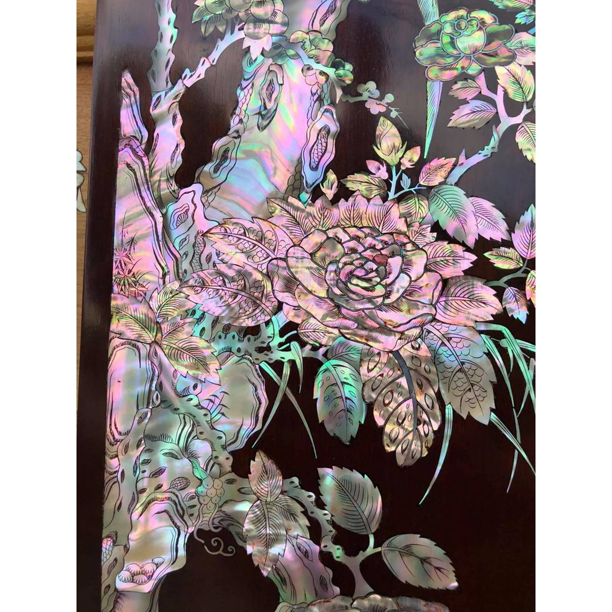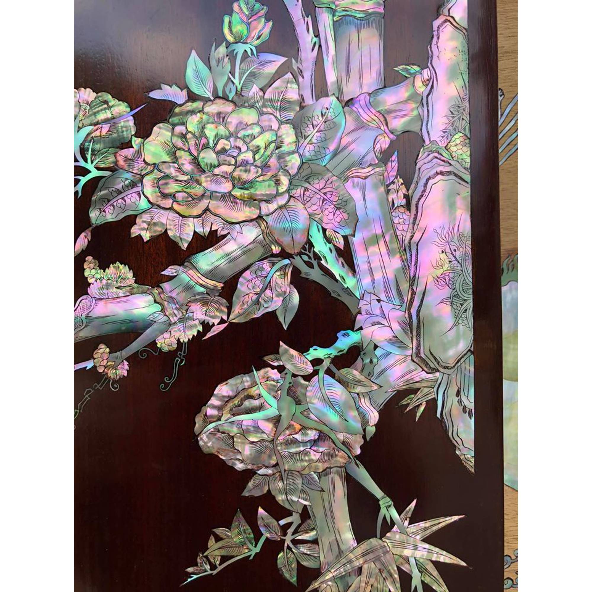 _Bộ đôi câu đối gỗ gụ lào .Kết hợp với khảm ốc đỏ tự nhiên 100% _ Kích thước câu đối ngang 25cm dài 227cm dầy 4cm _ Đôi câu đối được khảm ốc tỉ