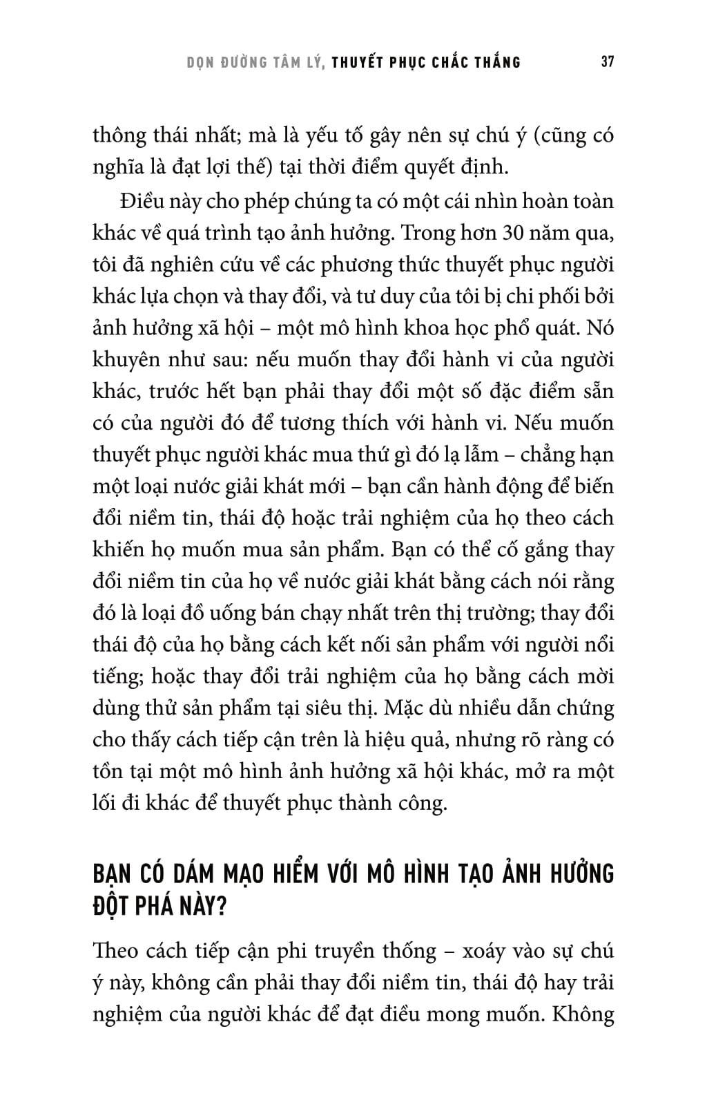 Điều gì làm nên sự khác biệt giữa một người giỏi giao tiếp và một người giỏi thuyết phục? Tác giả sách bán chạy Robert Cialdini, đồng thời là nhà tâm lý học được trích dẫn nhiều nhất trong thời đại chúng ta, đã giải thích tường tận trong "Dọn đường tâm lý, thuyết phục chắc thắng" về cách chuẩn bị và dẫn dắt người nghe trước khi truyền tải thông điệp đến họ và rồi thành công trong việc thuyết phục họ, với những kỹ năng chi tiết – những “chiến lược kinh doanh dựa trên cơ sở khoa học” - có thể dễ dàng được áp dụng trong các chiến dịch tiếp thị số hiện đại. Sách được Financial Times vinh danh là đầu sách kinh tế hay nhất năm 2016.