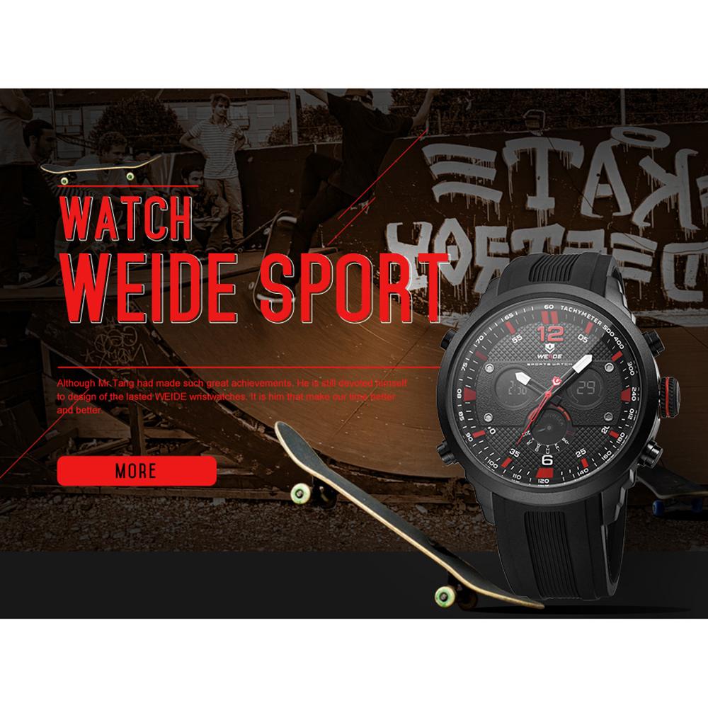WEIDE WH6105 is a dual display quartz digital men watch for big-dial lover with tachymeter engraved on the case and the function of stopwatch and week. Features: - Six attractive versions for option. - Flashing