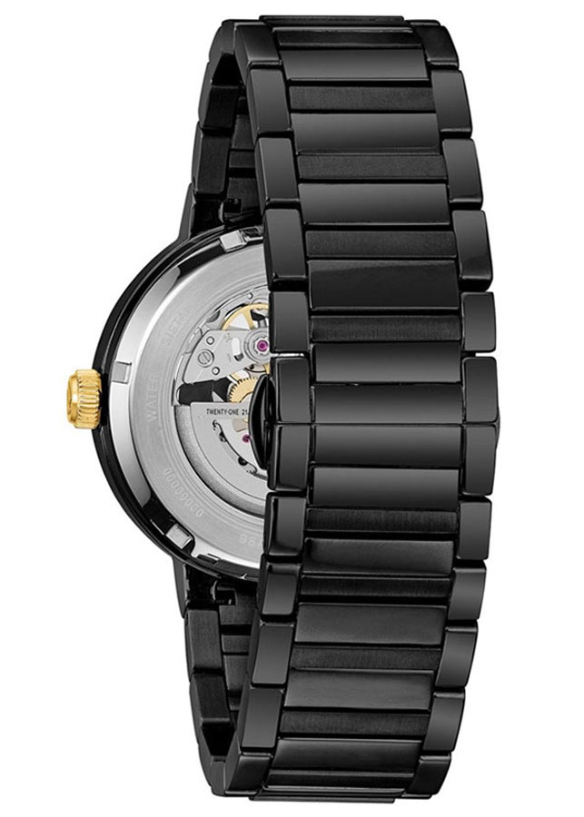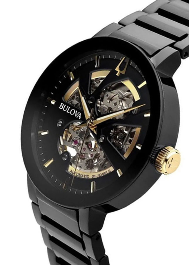 Review Đồng Hồ Bulova 98A203 kim chỉ mạ vàng nổi bật trên phần thiết kế Skeleton lộ máy