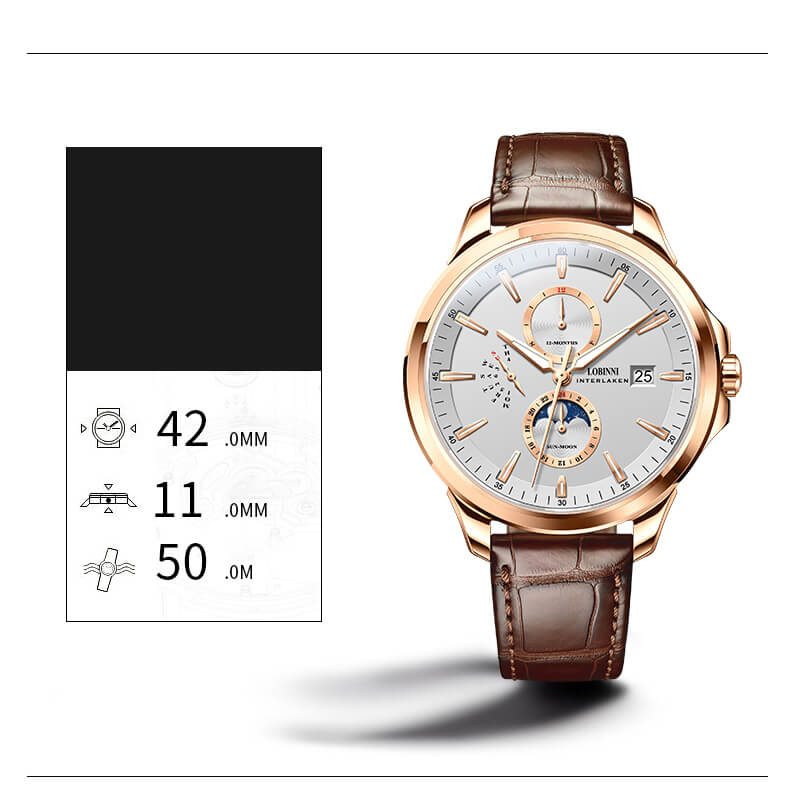 Đồng hồ nam chính hãng LOBINNI Thụy Sỹ Thiết kế sang trọng, đẳng cấp cho quý ông Thời gian trữ cót lâu lên đến 40h Chống nước 5ATM, Kính sapphire Toàn bộ máy được làm