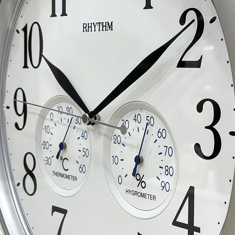 Mua tại TiktokĐồng hồ treo tường Rhythm, dùng pin (AAx1), vỏ nhựa cao cấp màu tráng, có 2 đồng hồ nhỏ thể hiện nhiệt độ và độ ẩm. . Kích thước 33.0 x 4.7cm, trọng lượng 760g