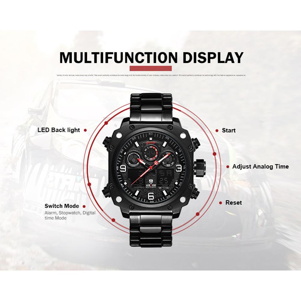 WEIDE WH6105 is a dual display quartz digital men watch for big-dial lover with tachymeter engraved on the case and the function of stopwatch and week. Features: - Six attractive versions for option. - Flashing