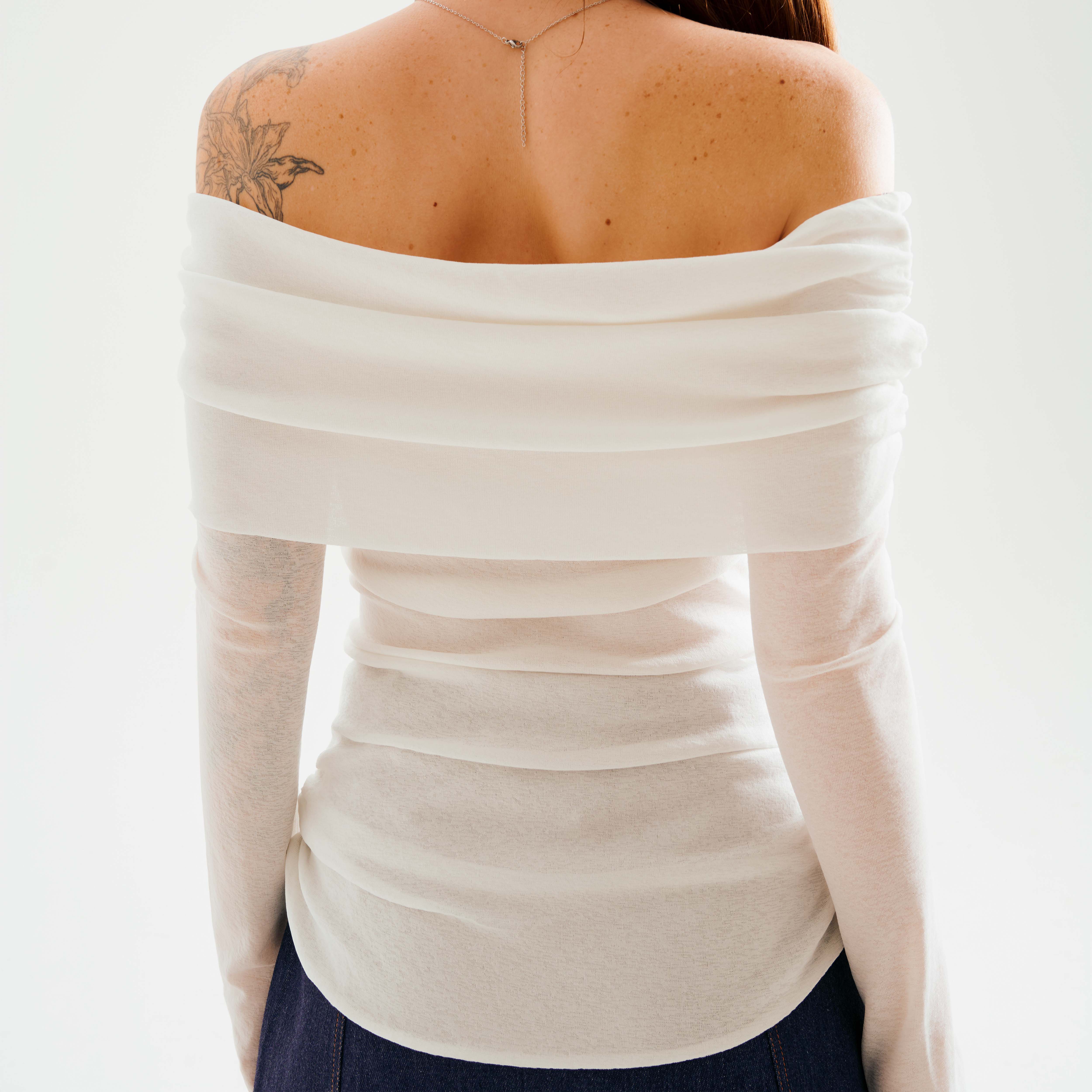 CHI TIẾT SẢN PHẨM - Sản phẩm : Áo nữ tay ngắn kiểu trễ vai chất liệu thích hợp mùa hè Muriel Miều Est.2013 - Chất liệu : Thun Cát - Màu sắc : KEM
