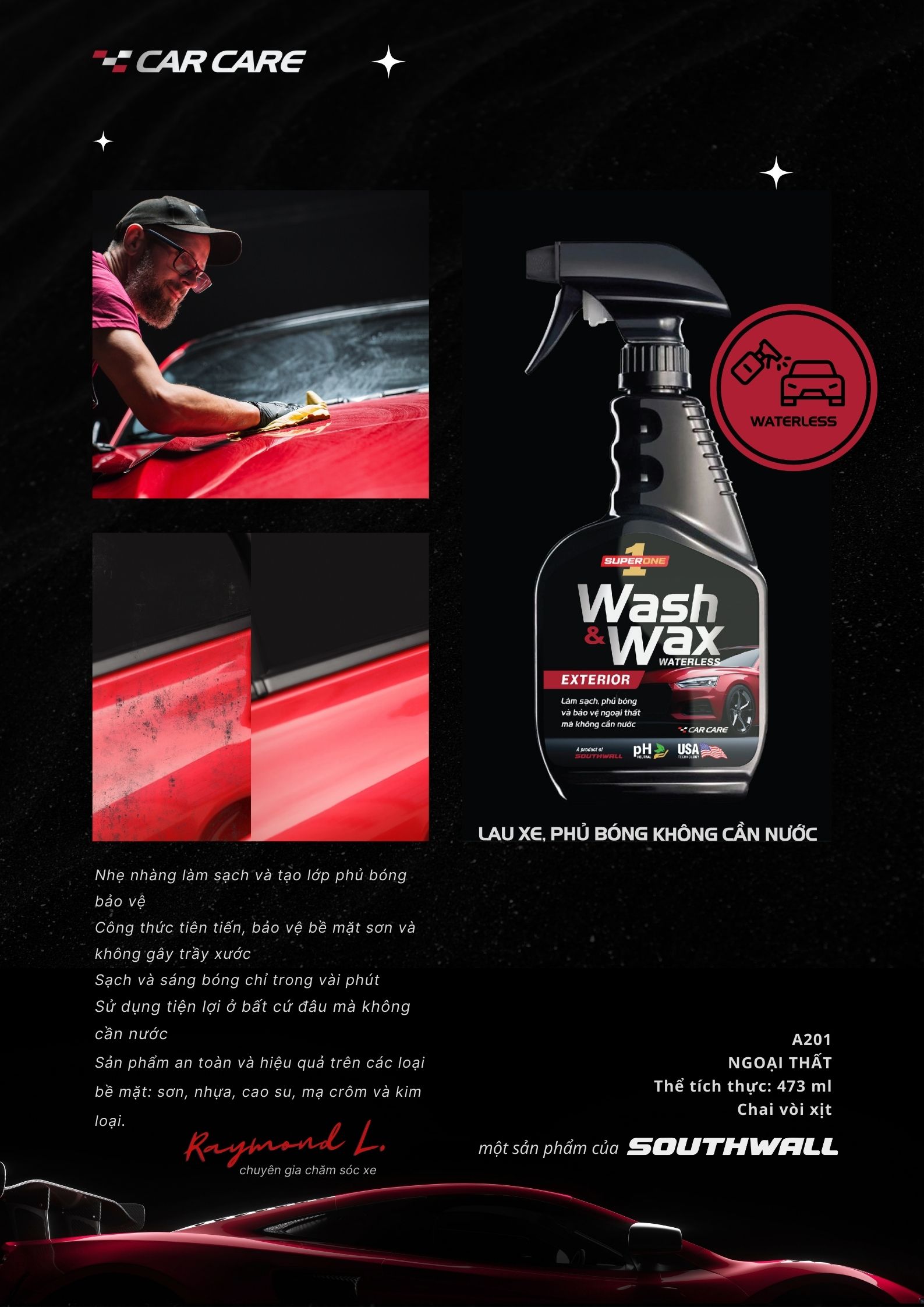 Mua tại TiktokLÀM SẠCH, PHỦ BÓNG VÀ BẢO VỆ NGOẠI THẤT MÀ KHÔNG CẦN NƯỚC Dung Dịch Lau Xe Và Phủ Bóng Ngoại Thất Không Cần Nước Super One Waterless Wash And Wax – Exterior nhẹ nhàng rửa sạch, tạo bóng và bảo vệ ngoại thất ô tô chỉ trong một bước dễ dàng. Sử dụng an toàn và hiệu quả gần như ở bất cứ bề mặt nào như sơn, nhựa, cao su, mạ crôm và kim loại. Công thức tiên tiến với lớp phủ bóng bề mặt xe, bảo vệ lâu dài hàng tuần. Sử dụng dễ dàng, nhanh chóng và không gây trầy xước hay mài mòn bề mặt vật liệu. Sản phẩm lý tưởng sử dụng cho các khu vực bị hạn chế tiếp cận nguồn nước như thành phố, căn hộ hoặc nước bị nhiễm phèn mặn. Đặc Tính Sản Phẩm