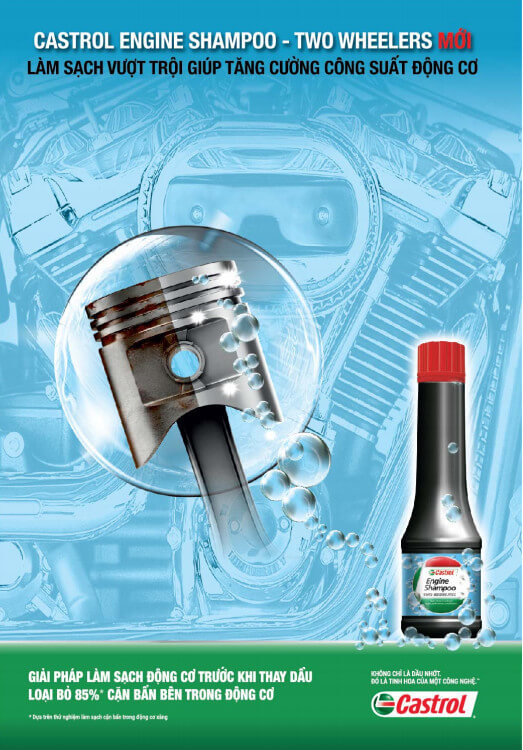 Điều kiện lái xe hiện đại khiến động cơ xe máy làm việc khắc nghiệt hơn, hình thành bụi bẩn và cặn bùn tích tụ bên trong động cơ. Nếu không được loại bỏ hoàn toàn khi thay dầu động cơ, các cặn bẩn này gây ảnh hưởng trực tiếp đến hoạt động của động cơ. Castrol Engine Shampoo - Two Wheelers là giải pháp súc rửa động cơ trước khi thay dầu, loại bỏ đến 85% cặn bẩn* bên trong động cơ, giúp làm sạch động cơ hiệu quả. Lợi điểm Làm sạch vượt trội giúp tăng cường công suất động cơ. Hướng dẫn sử dụng: Chuẩn bị: