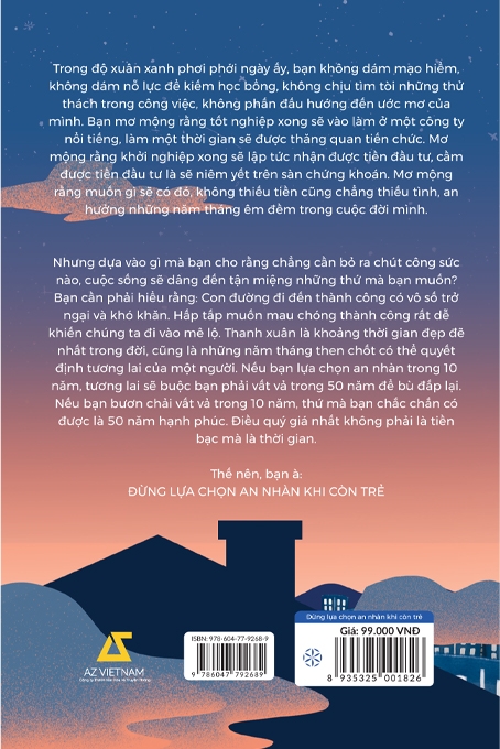 Nhưng vì sao bạn lại nghĩ rằng bạn chẳng cần bỏ ra chút công sức nào, cuộc sống sẽ dâng đến tận miệng những thứ bạn muốn? Bạn cần phải hiểu rằng: Hấp tấp muốn mau chóng thành công rất dễ khiến chúng ta đi vào mê lộ. Thanh xuân là khoảng thời gian đẹp đẽ nhất trong đời, cũng là những năm tháng then chốt có thể quyết định tương lai của một người. Nếu bạn lựa chọn an nhàn trong 10 năm, tương lai sẽ buộc bạn phải vất vả trong 50 năm để bù đắp lại. Nếu bạn bươn chải vất vả trong 10 năm, thứ mà bạn chắc chắn có được là 50 năm hạnh phúc. Điều quý giá nhất không phải là tiền mà là tiền bạc.