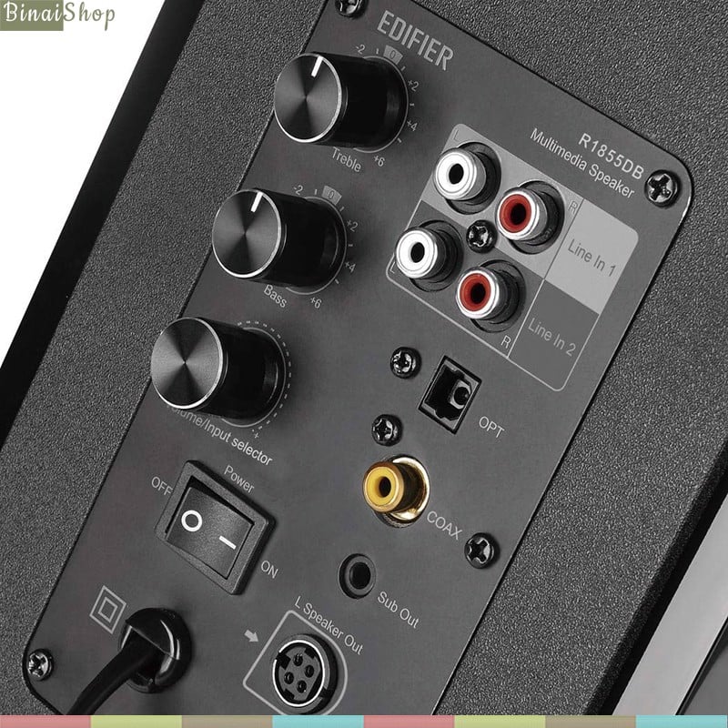 - Sách hướng dẫn THÔNG SỐ KỸ THUẬT Total Power Output 19Wx2 + 16Wx2 (RMS) Frequency Response 60Hz - 20kHz Signal-to-Noise Ratio ≥ 80dB (A) THD + N ≤0.2% Tweeter Unit Φ19mm silk diaphragm, 6 ohm Mid-Bass Unit 4inch (116mm) nomex diaphragm, 6 ohm Audio Inputs Bluetooth, Line In, Optical, Coaxial Audio Output Subwoofer output Input Sensitivity Line In 1: 400±50mV Line In 2: 600±50mV OTP: 350±50mFFS COAX: 350±50mFFS Bluetooth: 500±50mFFS Bluetooth Version V5.1 Dimension 155 x 254 x 223mm (W x H x D) Product Weight 7 kg Keyword: Edifier R1855DB, loa edifier, loa nghe nhạc, loa nghe nhạc cao cấp, loa nghe nhạc hay, loa nghe nhạc giá rẻ, loa máy tính, loa xem phim, loa xem phim nghe nhạc, loa xem phim giá rẻ, loa bookself, loa bluetooth