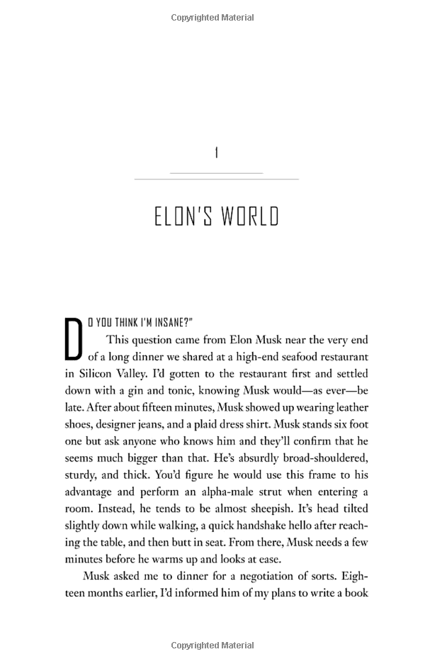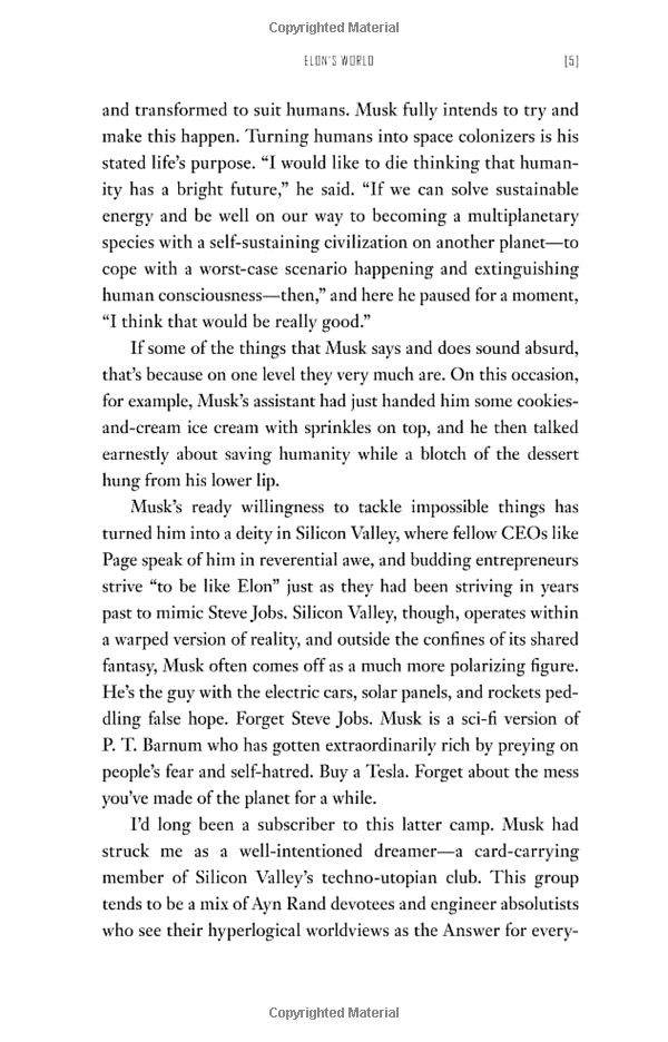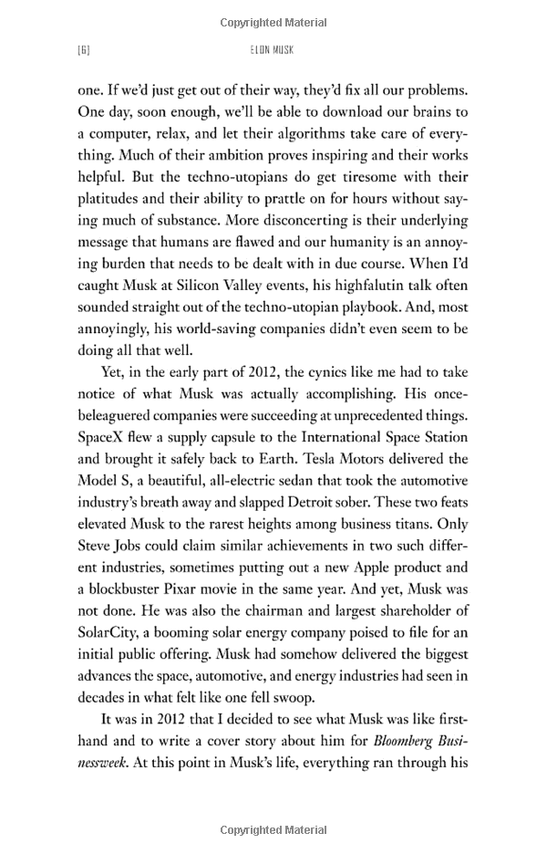 In Elon Musk: Tesla, SpaceX, and the Quest for a Fantastic Future, veteran technology journalist Ashlee Vance provides the first inside look into the extraordinary life and times of Silicon Valley's most audacious entrepreneur. Written with exclusive access to Musk, his family and friends, the book traces the entrepreneur's journey from a rough upbringing in South Africa to the pinnacle of the global business world. Vance spent more than 30 hours in conversation with Musk and interviewed close to 300 people to tell the tumultuous stories of Musk's world-changing companies: PayPal, Tesla Motors, SpaceX and SolarCity, and to characterize a man who has renewed American industry and sparked new levels of innovation while making plenty of enemies along the way.