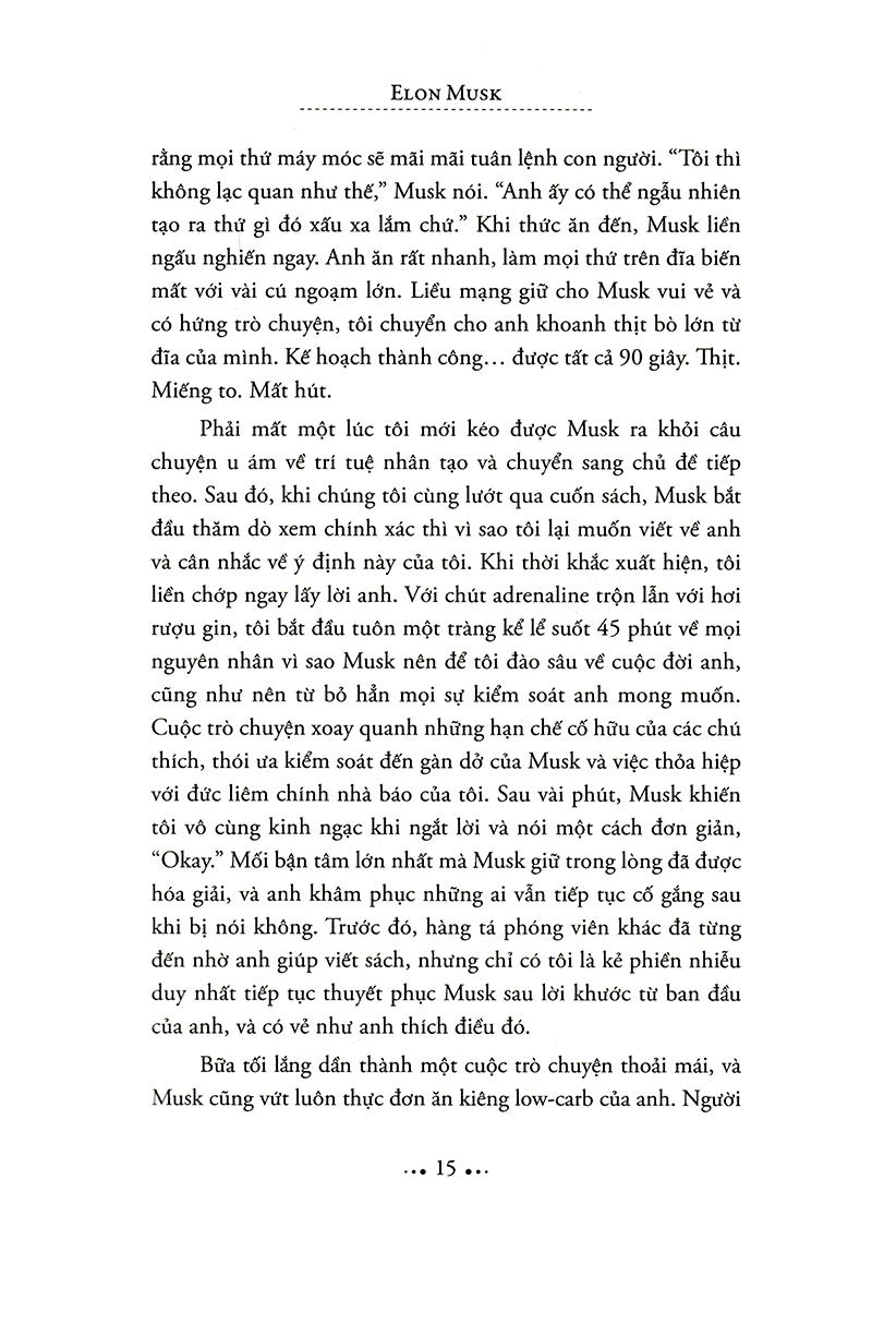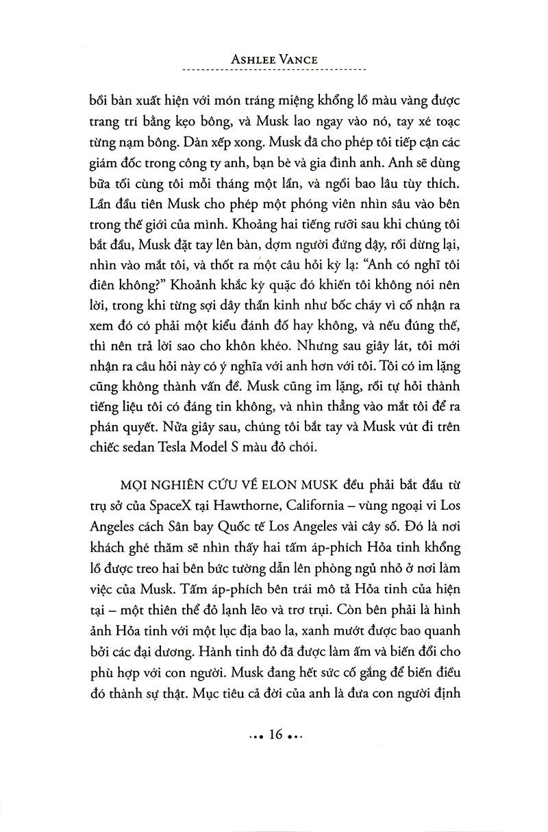 Trong cuốn Elon Musk: Tesla, SpaceX và sứ mệnh tìm kiếm một tương lai ngoài sức tưởng tượng, nhà báo công nghệ kỳ cựu Ashlee Vance đã mở cánh cửa đầu tiền nhìn vào cuộc sống phi thường của doanh nhân táo bạo nhất thung lũng Silicon. Được viết với độc quyền tiếp cận Musk, gia đình và bạn bè anh, cuốn sách lần theo cuộc hành trình của doanh nhân này, từ thuở nhỏ được nuôi dạy ở Nam Phi đến khi lên đến đỉnh cao của giới kinh doanh toàn cầu. Vance dành hơn 30 giờ trò chuyện với Musk và phỏng vấn gần 300 người để kể những câu chuyện đầy biến động về các công ty đang làm thay đổi thế giới mà Musk thành lập: PayPal, Tesla Motors, SpaceX và SolarCity, và để mô tả một người đàn ông đã tạo sức sống mới cho ngành công nghiệp Mỹ và thổi bùng tinh thần đổi mới ở một cấp độ khác, trong khi cũng tạo nên không ít kẻ thù trên con đường đó.
