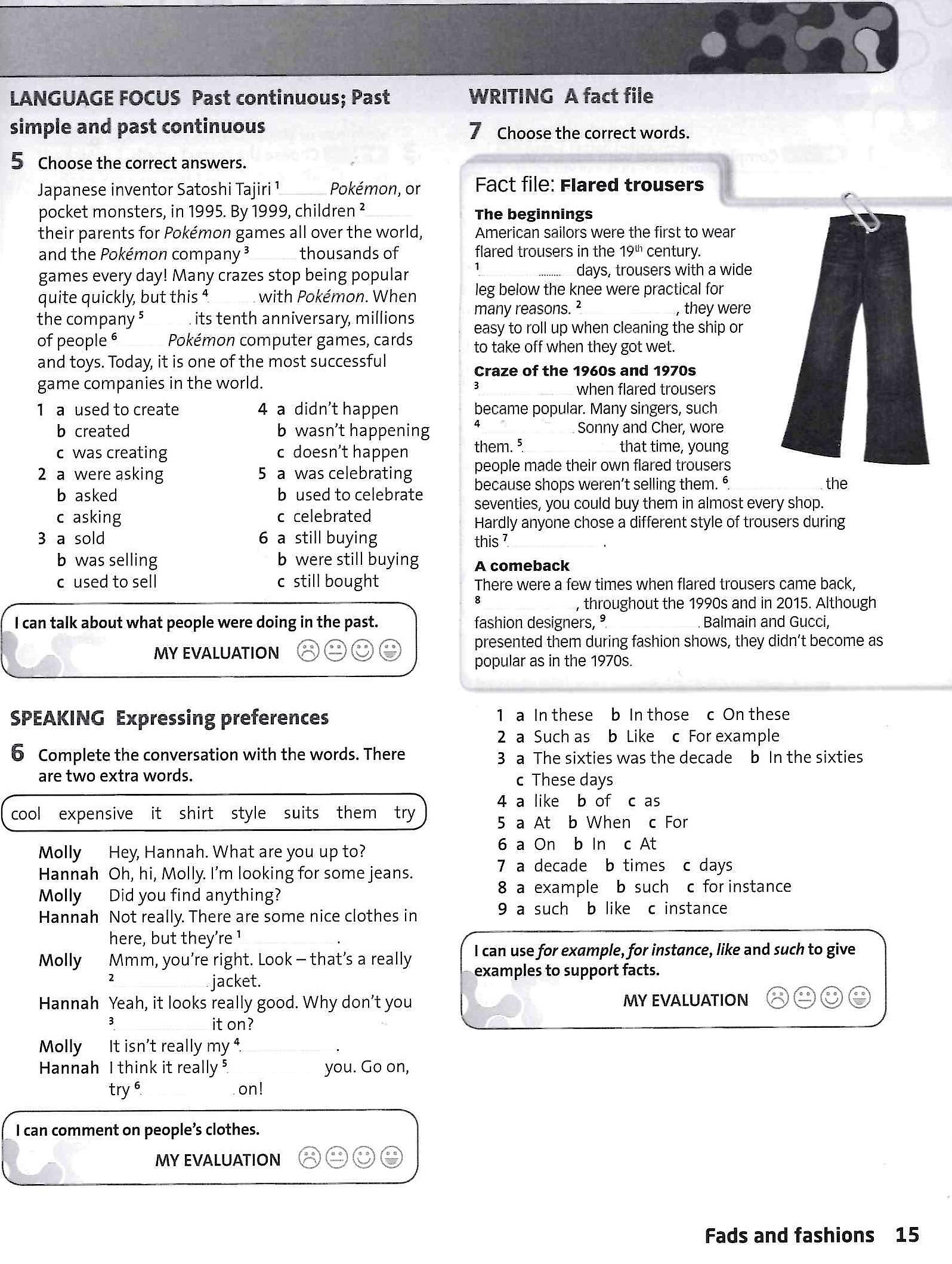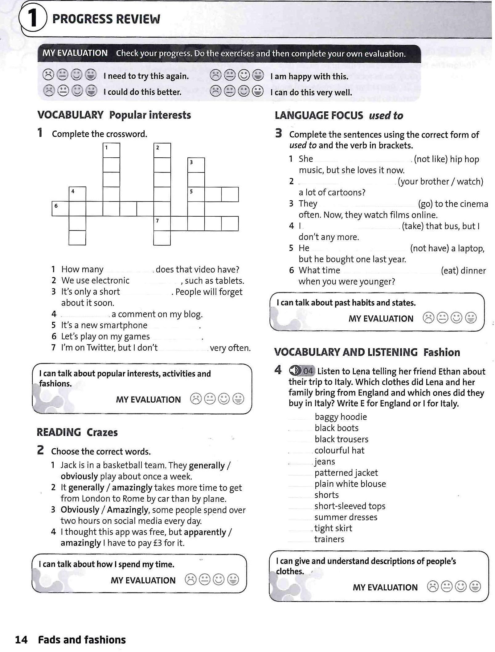 The Workbook includes exercises in grammar, vocabulary and skills, which mirror the language and skills work in the Student's Book pages. There are three levels of practice activities: one-star activities provide basic revision and language manipulation; two-star activities involve more productive exercises; and three-star activities are more open and offer more challenge. There is a two-page Progress review at the end of each unit. These exercises check understanding of all the vocabulary, grammar and skills presented in the unit. They also provide a record of what has been learned in the unit. The Self-evaluation section encourages students to think about their progress. This type of activity is also very helpful in students' development as learners because it encourages them to take responsibility for their own learning. There is a listening exercise in every Progress review. The audio for this is available on the online Practice Kit.