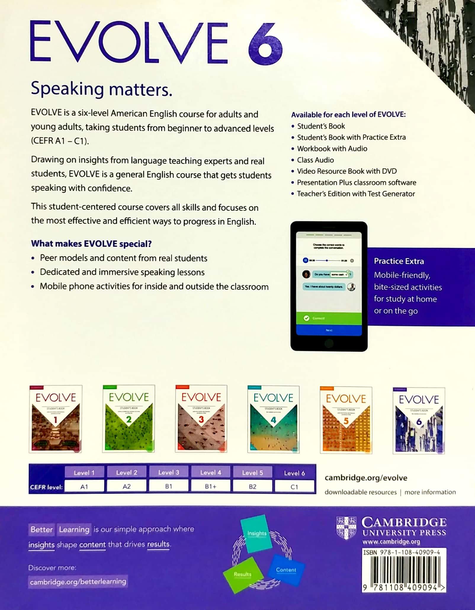 Mua tại TiktokEvolve Level 6 Workbook With Audio EVOLVE is a six-level English course that gets students speaking with confidence. Workbook Level 2 (CEFR A2) provides further practice of the Student's Book material, with multiple opportunities for consolidation in every unit. It includes activities focusing on all skills as well as functional language, and it can be used as homework or for additional practice in the classroom. The Workbook features listening activities with downloadable audio that students can listen to repeatedly.