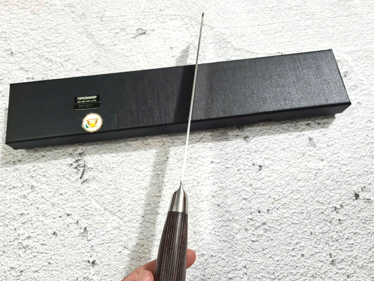 Chiều dài tổng thể: 33cm, Chiều dài lưỡi: 21cm ,Chiều rộng lưỡi: 2.7cm Độ dày: 2.5MM, CHẤT liệu lưỡi: 7Cr17MOV (thép 7 crom 17 molypden vanadi) Chất liệu CÁN: gỗ Cánh gà NẶNG : 2 lạng Mặt D dập chìm hoa văn rất đẹp