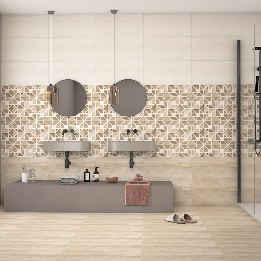 Hoạ tiết là sự kết hợp hài hòa giữa 3 màu be, nâu, trắng ngà và đen tạo nên một tone màu ấm áp, dịu nhẹ nhưng độ sáng vẫn vừa đủ để mang tính thoáng đãng cho căn phòng. Họa tiết là ngôi sao 8 cánh tối giản giúp tăng tính thẩm mỹ và sang trọng, phù hợp để ốp tường trang trí cho các không gian nhà tắm, nhà bếp, phòng khách, khu vực ngoại thất cùng với những loại gạch màu trơn để tạo sự tương phản và nổi bật thêm hoa văn.