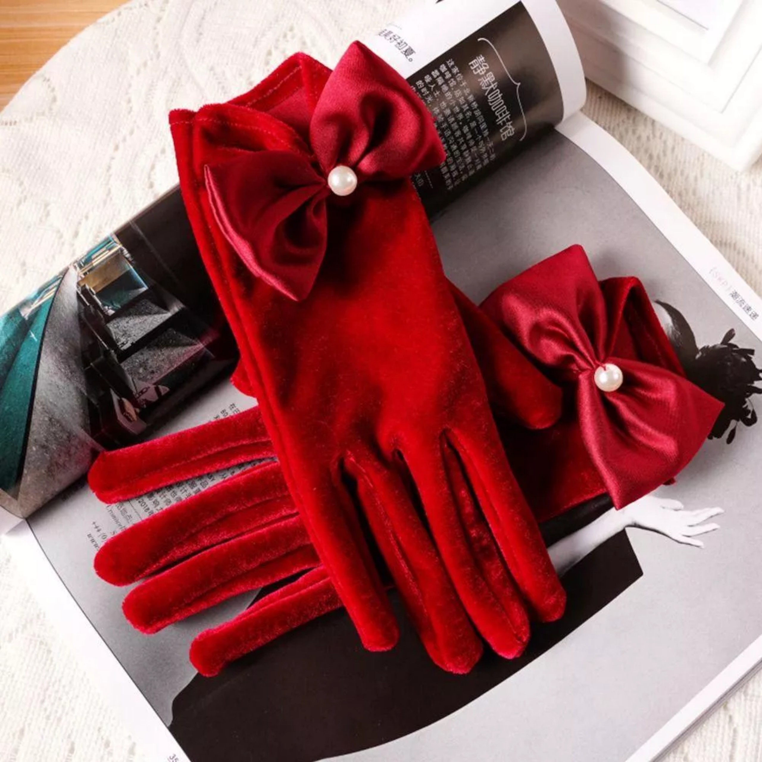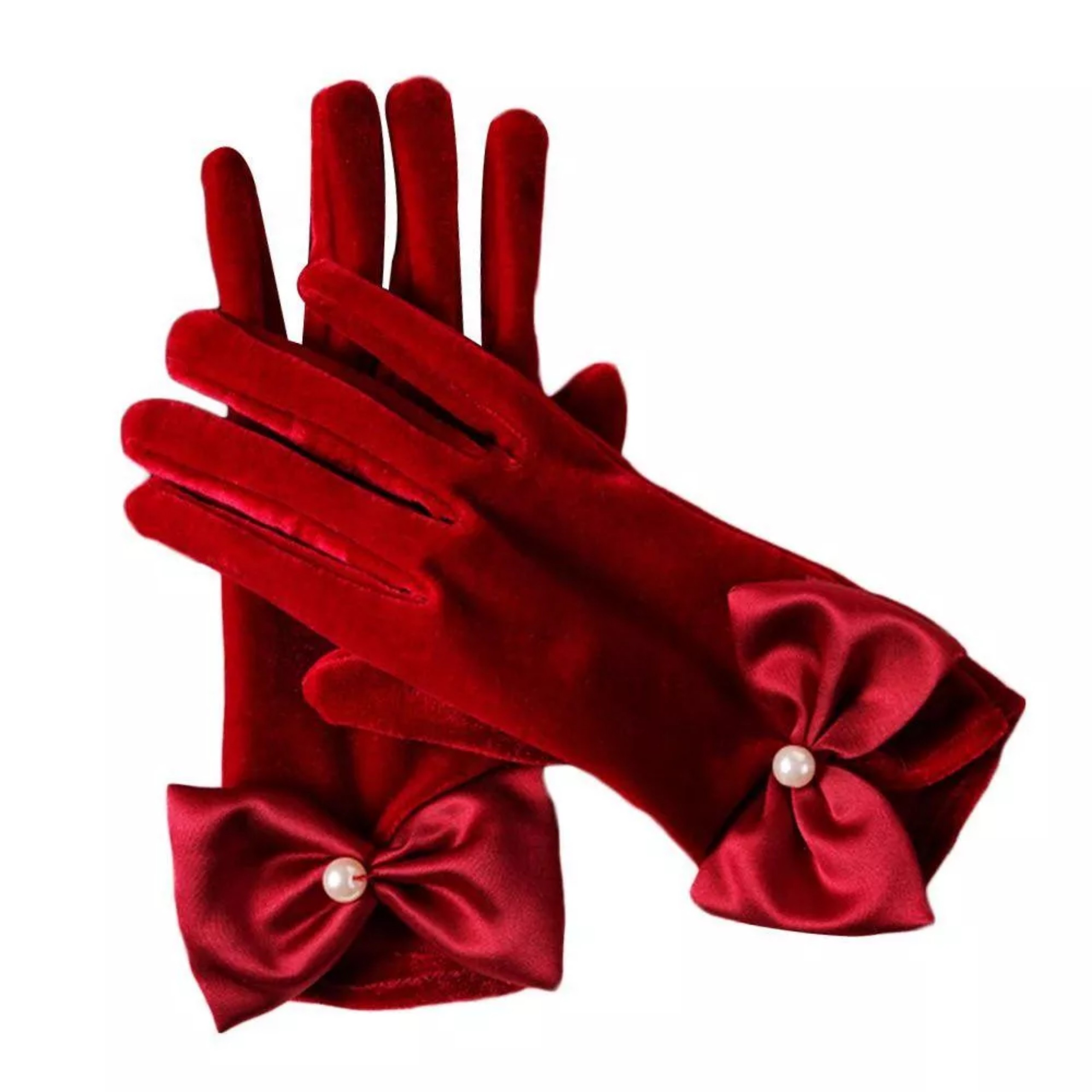 ✨Găng tay chất liệu nhung đính nơ ngọc trai màu đỏ đô cho Cô dâu và Dạ hội, đi tiệc, sự kiện, đạo cụ cosplay, chụp ảnh, studio MS: 45351