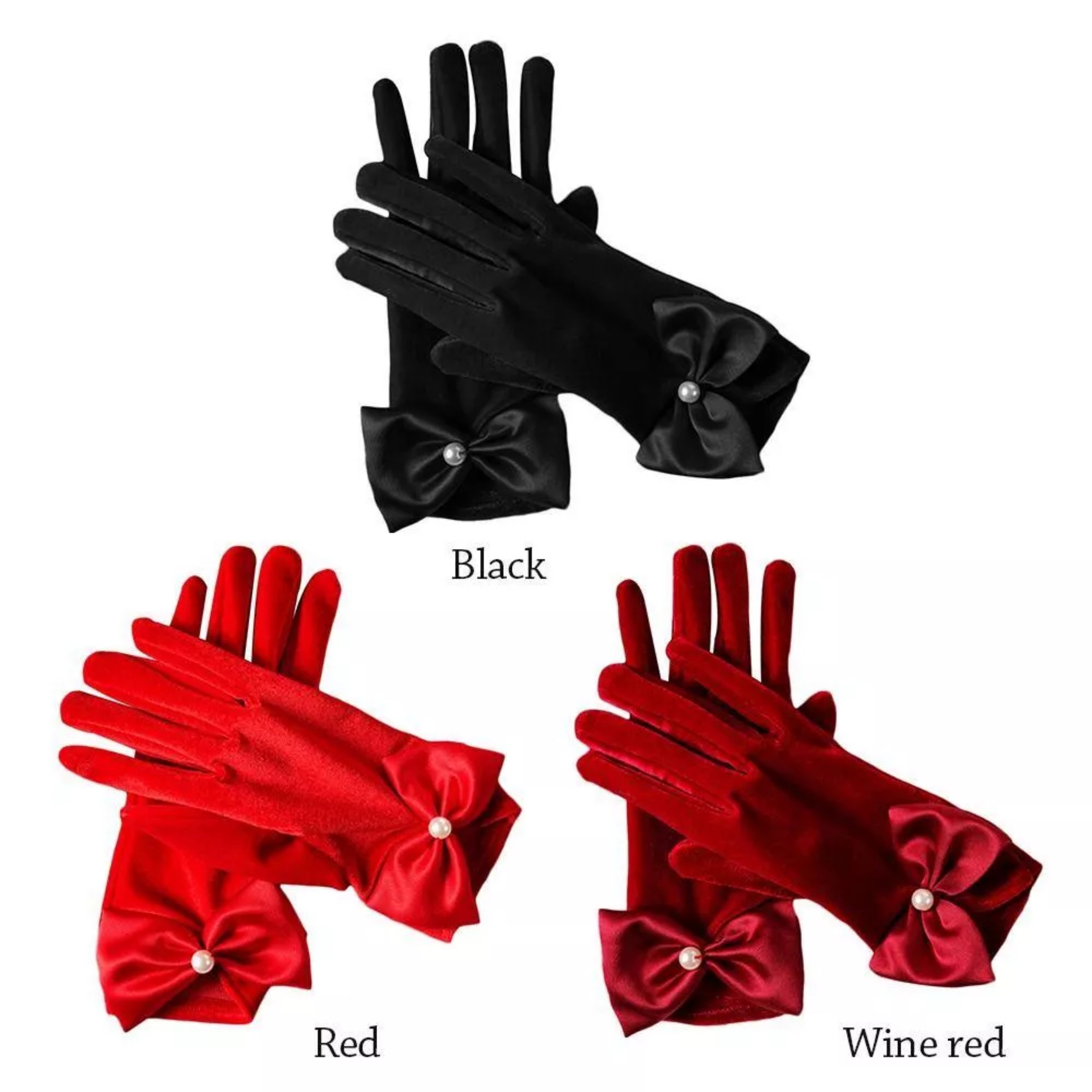 Găng tay Cô dâu và Dạ hội, đi tiệc, sự kiện. MS: 45451. Chất liệu: nhung, co giãn. Kiểu dáng: bao kín ngón, ôm tay, đính nơ và ngọc trai. Hoạ tiết: trơn. Độ dài: