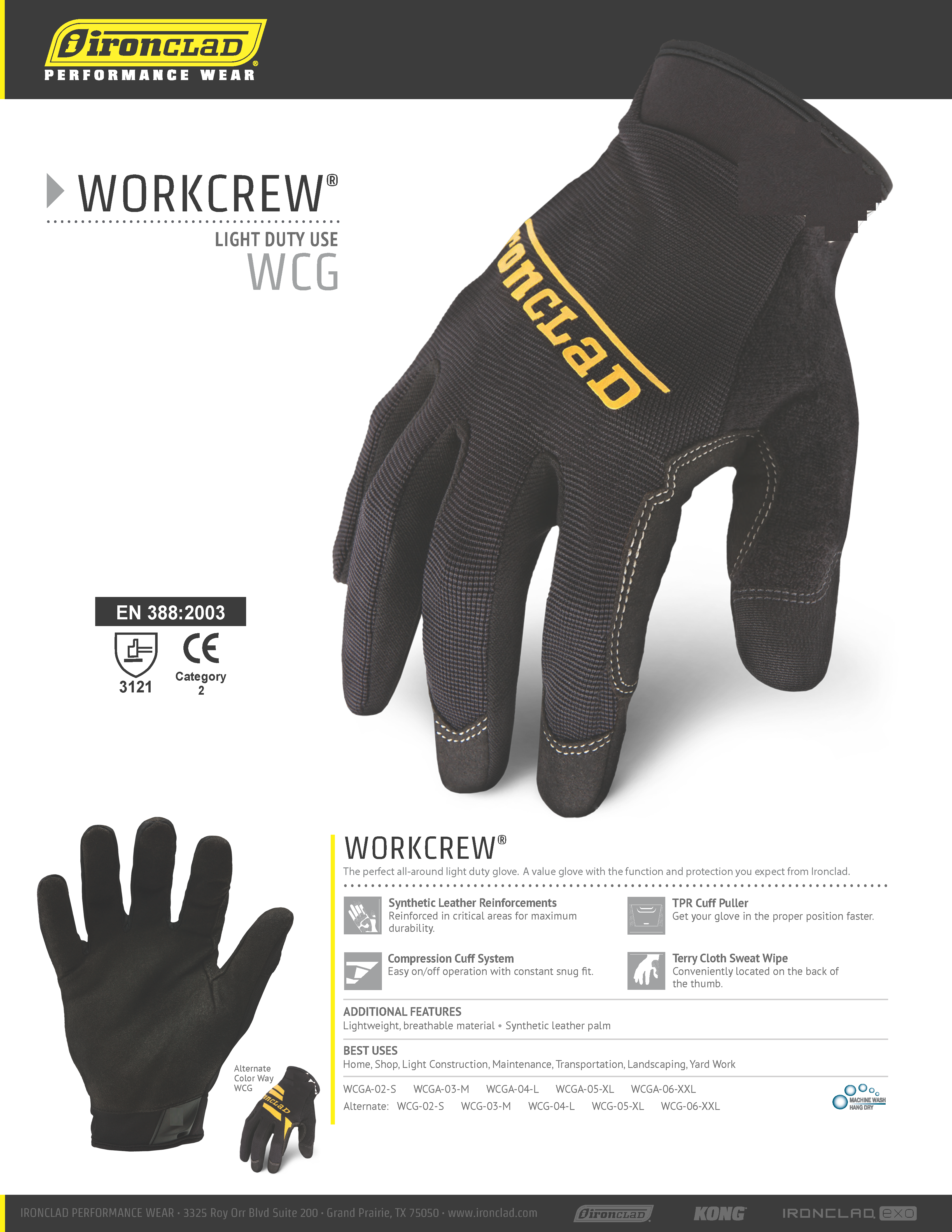 - Vật liệu từ da tổng hợp được gia cố ở những khu vực quan trọng để có độ bền tối đa cho găng tay. Thao tác mang găng tay dễ dàng và có độ khít phù hợp. Có khả năng thấm hút mồ hôi, thiết kế thuận tiện với khăn lau mồ hôi bằng vải Terry nằm ở phía sau của ngón tay cái. Sử dụng: Nhà, Cửa tiệm, Xây dựng nhẹ, Bảo trì, Vận chuyển, Quang cảnh, Làm vườn, Cơ khí, WORKCREW LIGHT DUTY USE FEATURES The perfect all-around light duty glove. A value glove with the function and protection you expect from Ironclad. SYNTHETIC LEATHER REINFORCEMENTS Reinforced in critical areas for maximum durability COMPRESSION CUFF SYSTEM Easy on/off operation with constant snug fit. TPR CUFF PULLER Get your glove in the proper position faster TERRY CLOTH SWEAT WIPE Conveniently located on the back of the thumb Lightweight, breathable material Synthetic leather palm Seamless, rolled index finger Synthetic leather reinforced fourchettes BEST USES Professional Mechanics, Power Sports, Hand & Power Tool Use