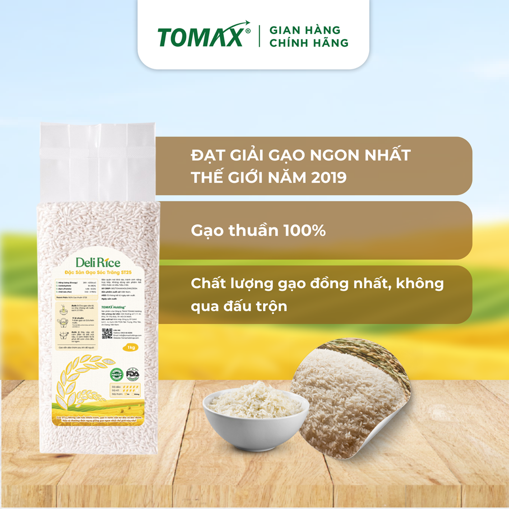 GẠO HỮU CƠ ST25 Tomax (1KG) THƯỢNG HẠNG, DẺO THƠM - TOMAX Với tâm huyết của một “lão nông tri điền”, ông Trần Văn Mây - Người sáng lập Gavi, đối tác sản xuất của TOMAX Holding đã nghiên cứu và ứng dụng phân bón hữu cơ vi sinh, kiến tạo mô hình nông nghiệp xanh tiêu biểu. Đồng thời tạo ra những sản phẩm an toàn, chất lượng cho người tiêu dùng, đưa giá trị gạo Việt vươn tầm thế giới. Được sản xuất từ 100% chế phẩm sinh học và các loại cây thảo dược có tính chất giải độc, phân bón hữu cơ vi sinh của TOMAX Holding đã nhanh chóng cải thiện chất lượng đất, nâng cao năng suất và chất lượng của cây lúa ngay vụ mùa đầu tiên. Đồng thời, Tomax còn sử dụng giống lúa thuần chủng, quản lý côn trùng và bệnh hại theo phương pháp sinh học, ứng dụng công nghệ thu hoạch, chế biến và đóng gói theo tiêu chuẩn quốc tế để tạo ra những cánh đồng vàng bất tận với chất lượng cao cấp nhất. Việc canh tác theo quy trình khép kín đã giúp TOMAX Holding thành công mang đến khách hàng những sản phẩm gạo sạch thượng hạng, trong đó có gạo đặc sản Sóc Trăng ST25 Tomax 100% hữu cơ - Loại gạo giành giải nhất trong cuộc thi "Gạo ngon nhất thế giới" năm 2019 – World’s Best Rice. Giá trị ưu việt của Gạo sạch đặc sản Sóc Trăng ST25 Tomax Được canh tác theo hướng hữu cơ với quy trình khép kín đạt chuẩn, gạo sạch ST25 của Tomax Holding sở hữu những ưu điểm vượt trội: Được chọn lựa kỹ lưỡng, từng hạt gạo ST25 trắng ngần, dài, và có hương thơm tự nhiên đặc trưng, mang đến bữa cơm mềm dẻo, ngọt dịu, giữ trọn vẹn giá trị dinh dưỡng và hương vị tinh tế. Hoàn toàn tự nhiên - Không thuốc bảo vệ thực vật; Không hương liệu nhân tạo; Không chứa chất tạo màu, chất bảo quản; Không chất tẩy trắng, Không GMO đảm bảo an toàn và nâng cao sức khỏe cho người tiêu dùng. Canh tác hữu cơ với tiêu chuẩn an toàn vệ sinh thực phẩm quốc tế HACCP, FDA Chuỗi sản xuất khép kín và đồng nhất (Field - Factory - Food): Dễ dàng truy xuất nguồn gốc và kiểm soát chất lượng gạo. Luôn đảm bảo sản phẩm mới, sạch và trọn vẹn dưỡng chất từ hạt gạo. Khả năng chủ động và tự cung ứng trong quá trình gieo trồng, sản xuất nên giá thành sản phẩm cạnh tranh hơn, giao hàng nhanh và chính sách hậu mãi tốt. Thông tin chi tiết sản phẩm gạo đặc sản Sóc Trăng ST25 Tomax Giá trị dinh dưỡng (trong 100g gạo):