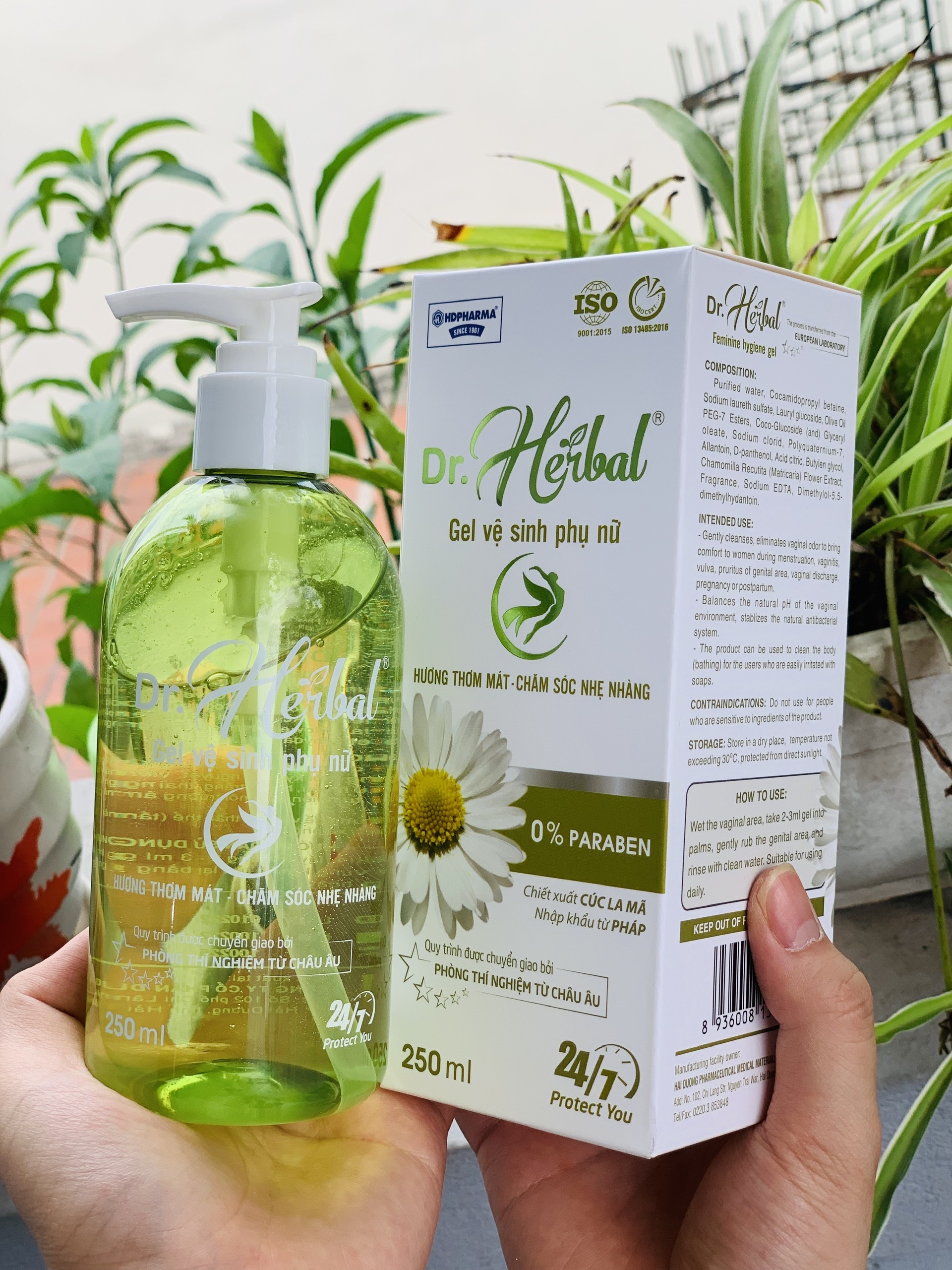 Gel vệ sinh phụ nữ Dr.Herbal - Hương thơm mát, chăm sóc dịu dàng được chị em tin chọn vì nhà sản xuất HDPHARMA cam kết thành phần không có Paraben (chất bảo quản hóa học); được chiết xuất từ Cúc La Mã nhập khẩu từ Pháp có tác dụng làm dịu các tổn thương da, giảm viêm, chống nhiễm khuẩn; quy trình sản xuất được chuyển giao từ phòng thí nghiệm châu Âu, theo chuẩn mực chất lượng cao nhất trên thế giới hiện nay là GMP EU.