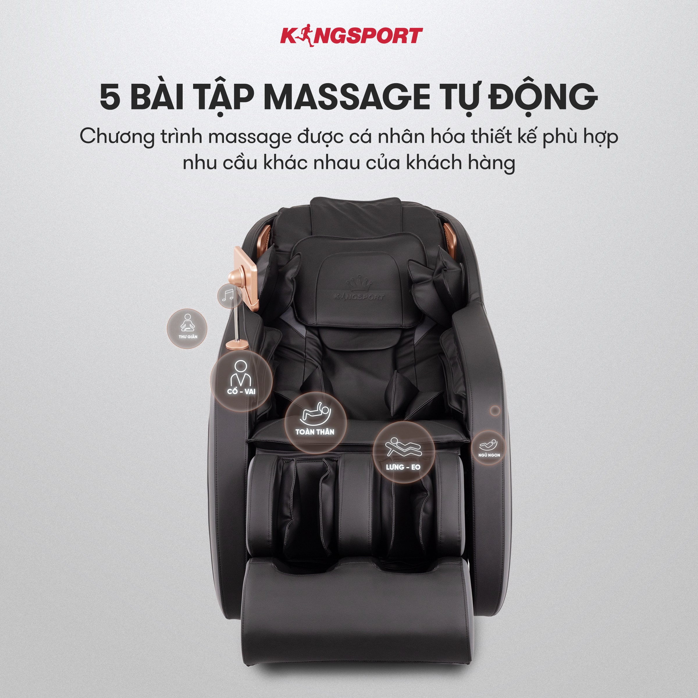 Chế độ massage tự động bao gồm 5 bài nên có thể giúp người dùng tự do trải nghiệm những tính năng mới, đáp ứng nhu cầu sử dụng hầu như của mọi thành viên trong gia đình.Bên cạnh đó, 5 chức năng này còn có thể điều chỉnh được lực tác động mạnh - nhẹ để người dùng có thể thoải mái với từng bài xoa bóp trên cơ thể. Massage không trọng lực là một trong số những tính năng trên ghế massage KingSport Standard G4 bởi vì nó giúp xương khớp thư giãn hoàn toàn, giảm cơn đ.a.u m.ỏ.i do các vấn đề và đ.ĩ.a đ.ệ.m hoặc c.h.ấ.n t.h.ư.ơ.n.g khác gây ra.