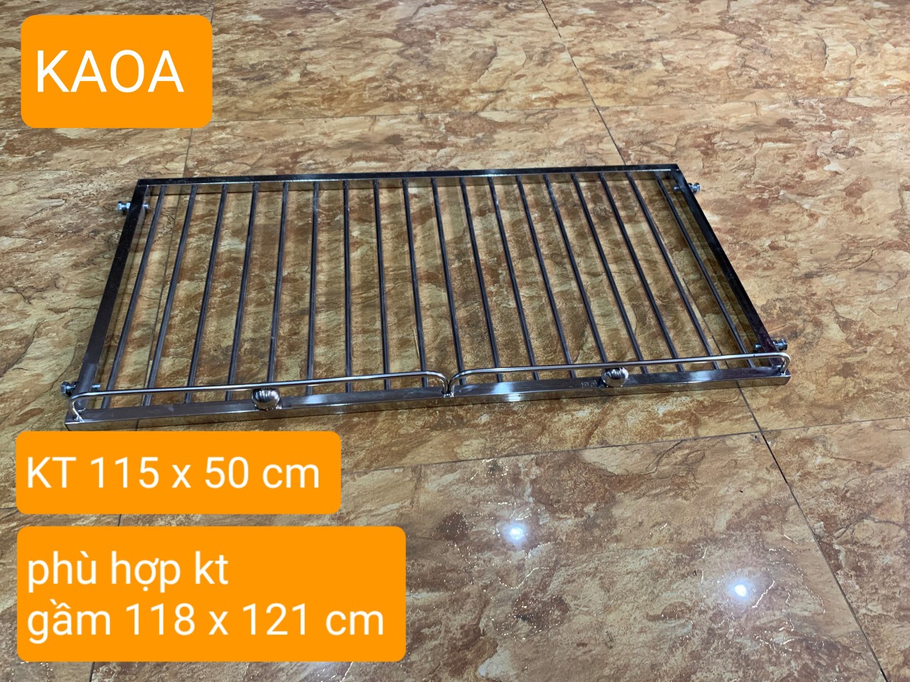 - / kích thước giá. rộng x sâu . 115 x 50 cm ( không tính bulong) 3./ sp được thiết kế thông minh với 4 bulong 2 bên rễ dàng tăng chỉnh linh hoạt theo kích thước dao động cho phép 4./ công năng . sử dụng chủ yếu xoong nồi . bát đĩa . rổ giá ác vận dụng nhà bếp vv 5./ khoảng cách nan phi 4 cm LƯU Ý BẮT BUỘC... kích thước giá 115 cm sẽ phù hợp với kích thước lắp đặt dao động từ 118 - 121 cm ƯU ĐIỂM ́ inox nhà bếp thông minh (KAOA) có thể rễ dàng tháo .lắp linh hoạt mỗi khi vệ sinh không gian phòng bếp cách lắp đặt đơn giản không cần thợ