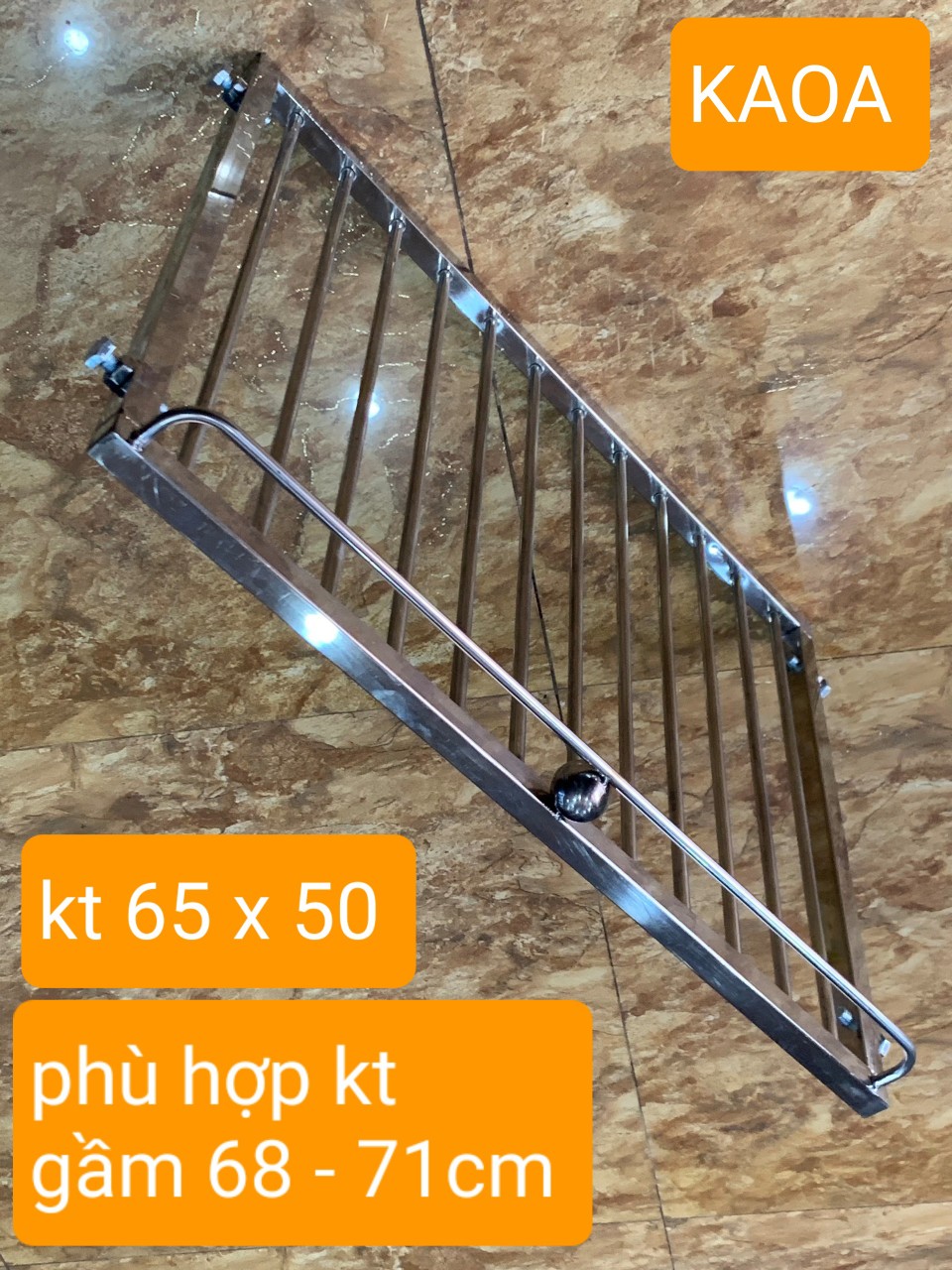 - / kích thước giá. rộng x sâu . 65 x 50 cm ( không tính bulong) 3./ sp được thiết kế thông minh với 4 bulong 2 bên rễ dàng tăng chỉnh linh hoạt theo kích thước dao động cho phép 4./ công năng . sử dụng chủ yếu xoong nồi . bát đĩa . rổ giá các vận dụng nhà bếp vv 5./ khoảng cách nan phi 4cm LƯU Ý BẮT BUỘC .. kích thước giá 65 cm sẽ phù hợp với kích thước lắp đặt dao động từ 68 - 71cm ƯU ĐIỂM ́ inox nhà bếp thông minh (KAOA) có thể rễ dàng tháo .lắp linh hoạt mỗi khi vệ sinh không gian phòng bếp cách lắp đặt đơn giản không cần thợ