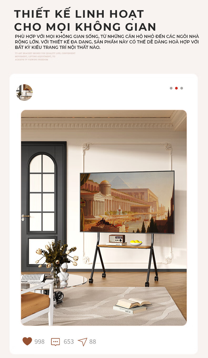 Công năng: Là mẫu giá treo tivi di động kèm kệ để đồ tiện lợi phù hợp nhiều không gian như phòng khách, phòng ngủ, phòng họp, phòng cộng đồng, ..