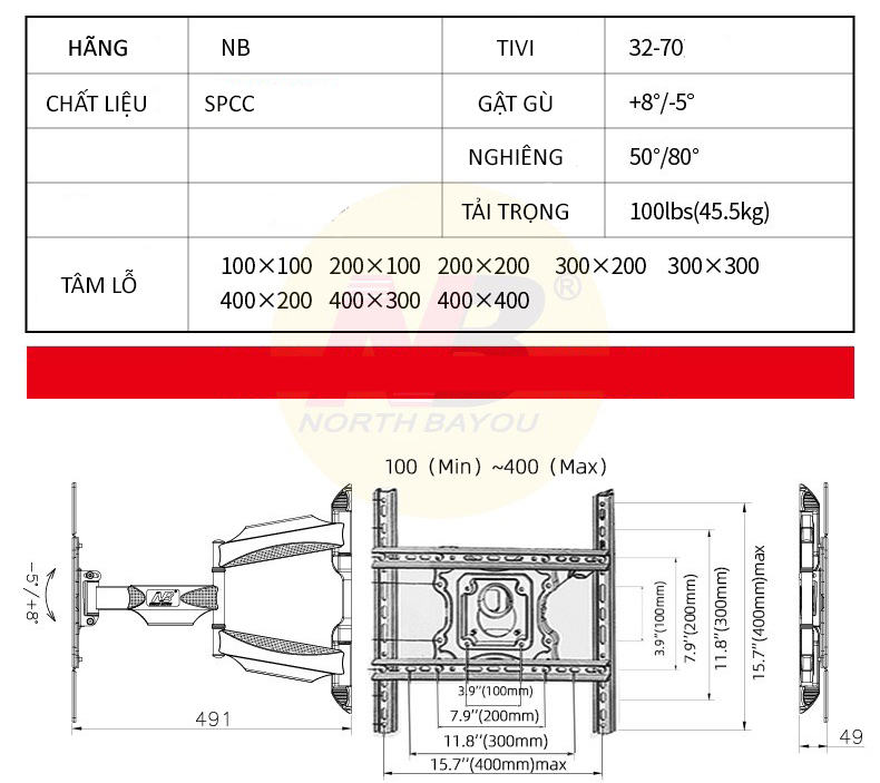 Thông số kĩ thuật - Vesa: 400x400 mm - Xoay 180 độ tại các khớp nối - Thiết kế kẹp nhựa đế nẹp dây điện - Khoảng cách kéo dãn tối đa: 468mm - Thu