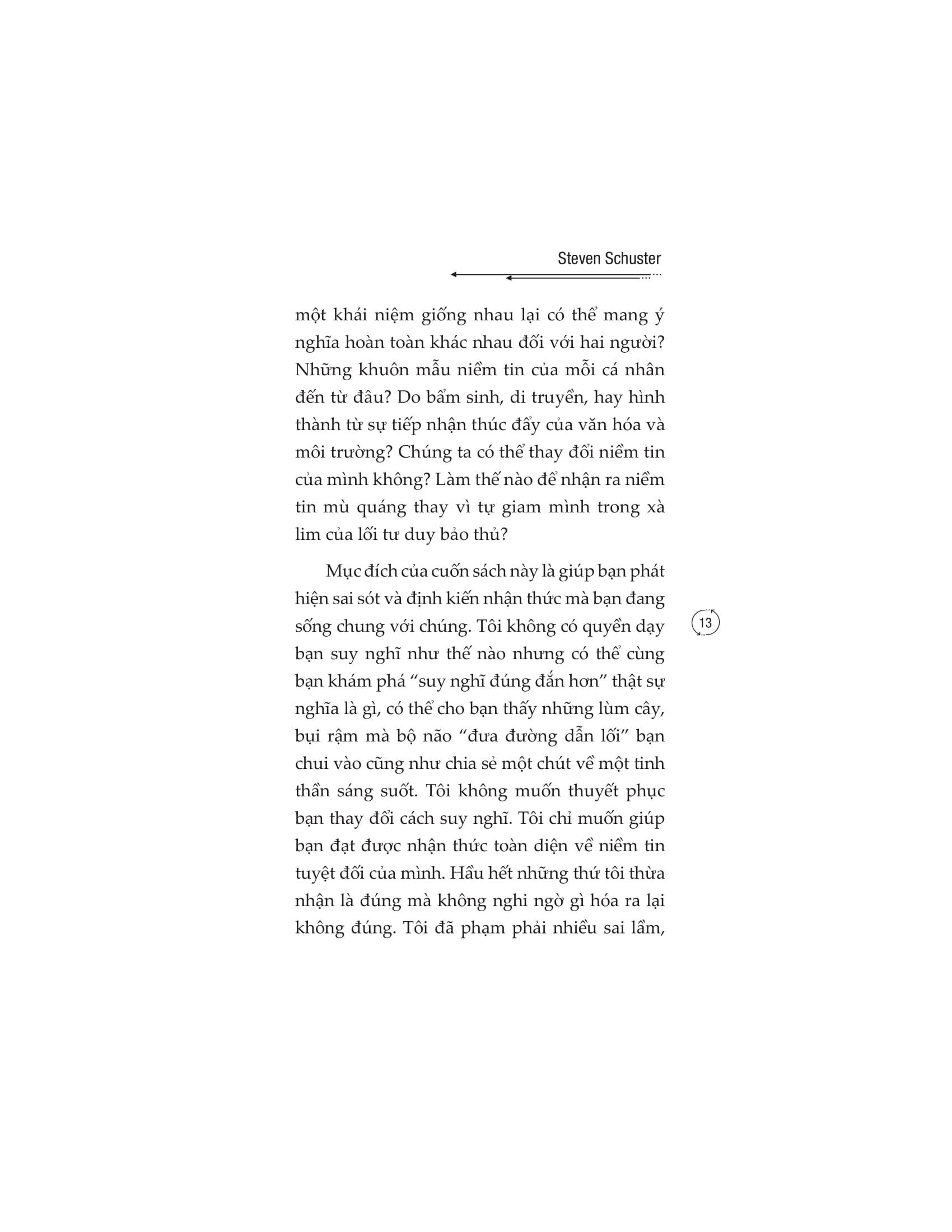 “Bản chất con người vốn hay suy nghĩ. Chính khả năng suy nghĩ đó khiến chúng ta khác biệt với các giống loài khác. Chúng ta nhận thức được việc mình suy nghĩ. Thói quen nhận thức ngày càng phát triển hơn khi chúng ta lớn lên. Chúng ta học hỏi từ cha mẹ. Sau đó đi học, lên đại học, tìm được công ăn việc làm, đọc thật nhiều sách, xem cả tá phim ảnh và kết nối với mọi người. Mỗi một hoạt động này đều vô tình ảnh hưởng đến cách suy nghĩ của chúng ta. Kinh nghiệm nhận thức định hình thế giới quan của mỗi người. Mọi thứ mà cá nhân chúng ta trải nghiệm sẽ đi qua bộ lọc của bản thân và được hợp thức hóa. Rất thực tế. Còn thực tế hơn cả những thứ chúng ta chưa từng trải qua. Cho dù những điều chúng ta tin có thể không phải lúc nào cũng đúng.”