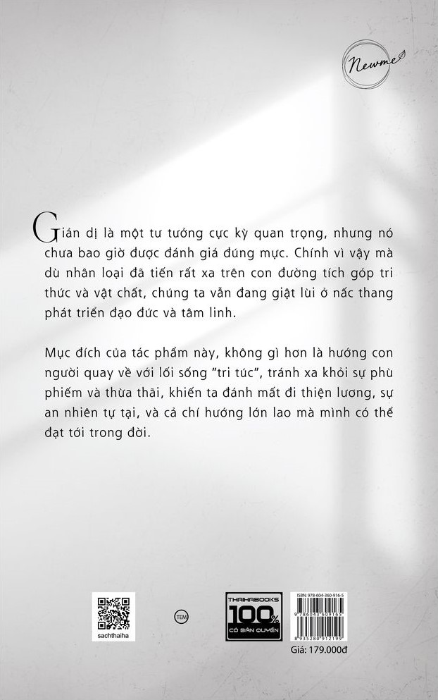 Trong cuốn sách này, tác giả Nguyễn Đỗ Thành Đạt đã đưa ra những suy nghiệm và tư tưởng về phương cách sống giản dị, một lối sống được nhiều người theo đuổi. Với mong muốn mang tới cho bạn đọc trước hết sự thay đổi trong tâm thức, để hiểu tại sao chúng ta cần sống một cuộc đời đơn giản hơn, nói cách khác, tại sao tư tưởng giản dị lại chính là chìa khóa giải quyết mọi vấn đề mà nhân loại đang phải đối mặt.