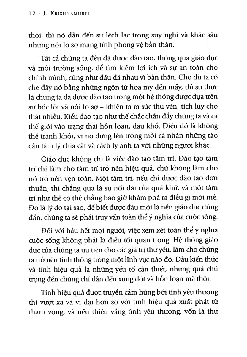 Khi phát biểu rằng: nếu ta được giáo dục chỉ để trở nên khác biệt, giành lấy một công việc tốt hơn, có nhiều năng lực hơn, thống trị người khác nhiều hơn, thì cuộc sống của ta sẽ trở nên hời hợt và trống rỗng vô cùng, J.Krishnamurti đã tạo nên sự rúng động không chỉ ở Ấn Độ, quê hương ông, mà còn với cả thế giới.
