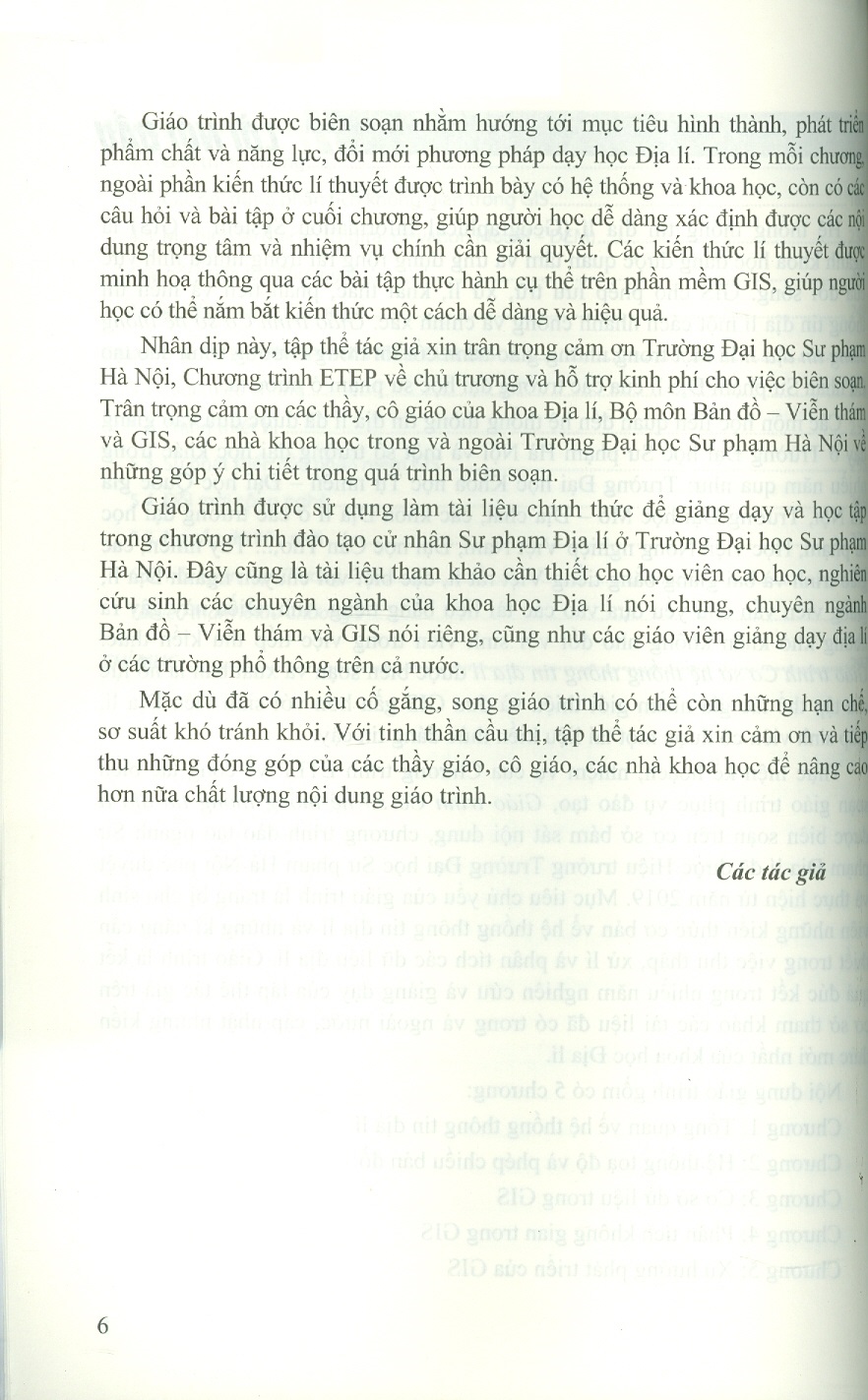 thông tin địa lí một cách nhanh chóng và chính xác. Giáo trình Cơ sở hệ thống thông tin địa lí là một trong những giáo trình cốt lõi trong chương trình đào tạo Cử nhân Sư phạm Địa lí của các trường đại học sư phạm ở nước ta.