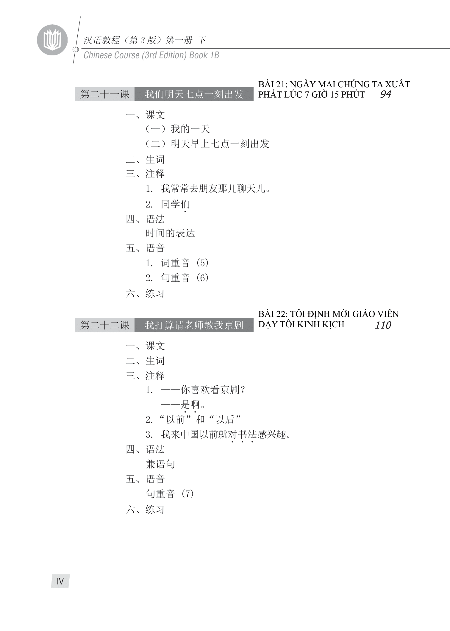Giáo Trình Hán Ngữ 4 - Tập 2: Quyển Hạ (Phiên Bản 3) Các bài học trong “Giáo trình Hán ngữ” Tập 1 và Tập 2 được thiết kế như sau: 1. Bài đọc, 2. Từ mới, 3. Chú thích, 4. Ngữ âm, Ngữ pháp, 5. Luyện tập. 1. Bài đọc Bài khóa ở Tập 1 và Tập 2 (từ bài 1 đến bài 50) chủ yếu là những đoạn hội thoại thực tế, ngoài ra có biên soạn một vài đoạn văn trần thuật. Bài khóa là một phần quan trọng nhất trong giáo trình, và cũng là nội dung giảng dạy chủ yếu trên lớp. Bài khóa là môi trường để ứng dụng ngữ pháp và từ vựng. Ngữ pháp là cấu trúc khung khi thiết kế bài khóa và cũng là một sợi dây liên kết ngầm. Tách riêng khỏi bài khóa, ngữ pháp sẽ không còn môi trường để ứng dụng. Hoạt động giảng dạy tiếng Hán trên lớp ở giai đoạn sơ cấp nên kết hợp cả ba yếu tố này trên cơ sở tuân thủ nguyên tắc ngữ pháp từ dễ đến khó. Phải giúp cho sinh viên hiểu ngữ cảnh sử dụng câu, để sinh viên từng bước nắm được cách biểu đạt câu từ cho chính xác trong từng ngữ cảnh cụ thể. Mục đích của chúng ta là lấy ngữ pháp làm kim chỉ nam cho việc học bài khóa, thông qua kỹ xảo như đọc diễn cảm, đọc thuộc, viết lại bài khóa… để nâng cao kỹ năng nghe, nói, đọc, viết cho sinh viên và củng cố khả năng giao tiếp xã hội bằng tiếng Hán. Việc giảng dạy trên lớp nên chú ý tập trung cho sinh viên nghe, đọc, nói lại bài khóa. Tất cả các phần như từ mới, chú thích, và ngữ pháp đều phục vụ cho việc dạy và học bài khóa. 2. Từ mới Ở Tập 1 và Tập 2 của bộ giáo trình có tổng cộng hơn 1600 từ mới. Tiêu chí lựa chọn những từ này chính là tần suất sử dụng thường xuyên của nó. Hơn nữa mỗi bài chỉ có một lượng từ nhất định. Trên lớp, các thầy cô hãy giảng dạy từ mới trong câu bởi chỉ có câu và bài khóa mới có khả năng quy định tính duy nhất về nghĩa của từ. 3. Chú thích Phần chú thích trong giai đoạn ngữ âm chủ yếu giới thiệu kiến thức cơ bản về ngữ âm tiếng Hán. Còn ở giai đoạn ngữ pháp và mẫu câu, chủ yếu giới thiệu và giải thích một số kiến thức trọng điểm về ngôn ngữ và bối cảnh văn hóa Trung Quốc. Đối với những câu có điểm ngữ pháp xuất hiện trong bài khóa nhưng chưa được giải thích, hãy để sinh viên được hiểu nghĩa thông qua phần dịch nội dung chú thích. 4. Ngữ âm, ngữ pháp Bộ giáo trình dành 10 bài để giảng dạy ngữ âm. Nhưng nói một cách nghiêm túc, việc luyện tập ngữ âm, ngữ điệu cần phải xuyên suốt cả giai đoạn sơ cấp. Tầm quan trọng của việc luyện tập ngữ âm là rất lớn và cần đặc biệt nhấn mạnh. Phải lưu ý rằng, ở giai đoạn mẫu câu và đoạn văn, việc giảng dạy ngữ âm cần được tiến hành kết hợp với việc luyện đọc to và học thuộc bài khóa. Các bài luyện đọc ngữ âm được thiết kế trong phần bài tập chỉ mang tính chất gợi ý. Phần ngữ pháp của giáo trình sẽ không quá chú trọng tính hệ thống, thế nhưng nó được biên soạn theo nguyên tắc từ dễ đến khó, nắm bắt dần dần. Vì vậy, nếu không hoàn thành tốt nhiệm vụ giảng dạy của Tập 1 và Tập 2 mà giảng dạy ngay vào Tập 3 sẽ gặp phải nhiều khó khăn. Cần nhấn mạnh rằng, bộ giáo trình này dựa vào cấu trúc ngữ pháp tiếng Hán để giảng dạy bài đọc, dạy sinh viên nói tiếng Trung theo kết cấu ngữ pháp. Do đó, việc giải thích ngữ pháp cần ngắn gọn, rõ ràng, đơn giản, mạch lạc, bắt đầu từ cấu trúc ngữ pháp rồi giải thích ngữ nghĩa, chức năng, ngữ dụng; dạy sinh viên cách vận dụng ngữ pháp để nói, viết, biểu đạt tiếng Hán. Trên lớp, giáo viên có thể sử dụng nhiều phương pháp hình tượng, trực quan như tranh ảnh, động tác, phần mềm máy tính… để giảng giải các hiện tượng ngữ pháp, giúp sinh viên nắm bắt ý nghĩa, chức năng và ngữ cảnh của từng điểm ngữ pháp nhằm nâng cao khả năng giao tiếp bằng tiếng Hán của sinh viên. 5. Luyện tập Các bài tập trong giáo trình chú trọng nguyên tắc học tập đi từ lý giải, mô phỏng, ghi nhớ, thành thạo rồi đến ứng dụng. Các dạng bài tập bao gồm bài tập lý giải, bài tập mô phỏng và bài tập giao tiếp,… hỗ trợ cả nhu cầu học trên lớp lẫn nhu cầu tự học ở nhà. Giáo viên có