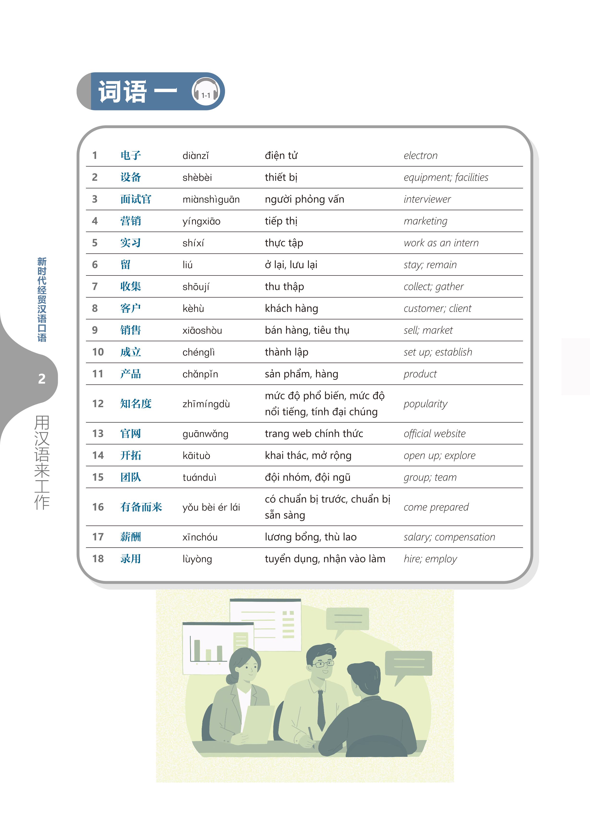 • Từ ngữ và Hội thoại: Nội dung cốt lõi của mỗi bài. Mỗi bài học hai đoạn hội thoại liên quan đến chủ đề bài học, thúc đẩy tình tiết câu chuyện phát triển, đồng thời nắm vững các từ ngữ trọng điểm liên quan, đặc biệt là các từ ngữ thường dùng trong môi trường kinh doanh.