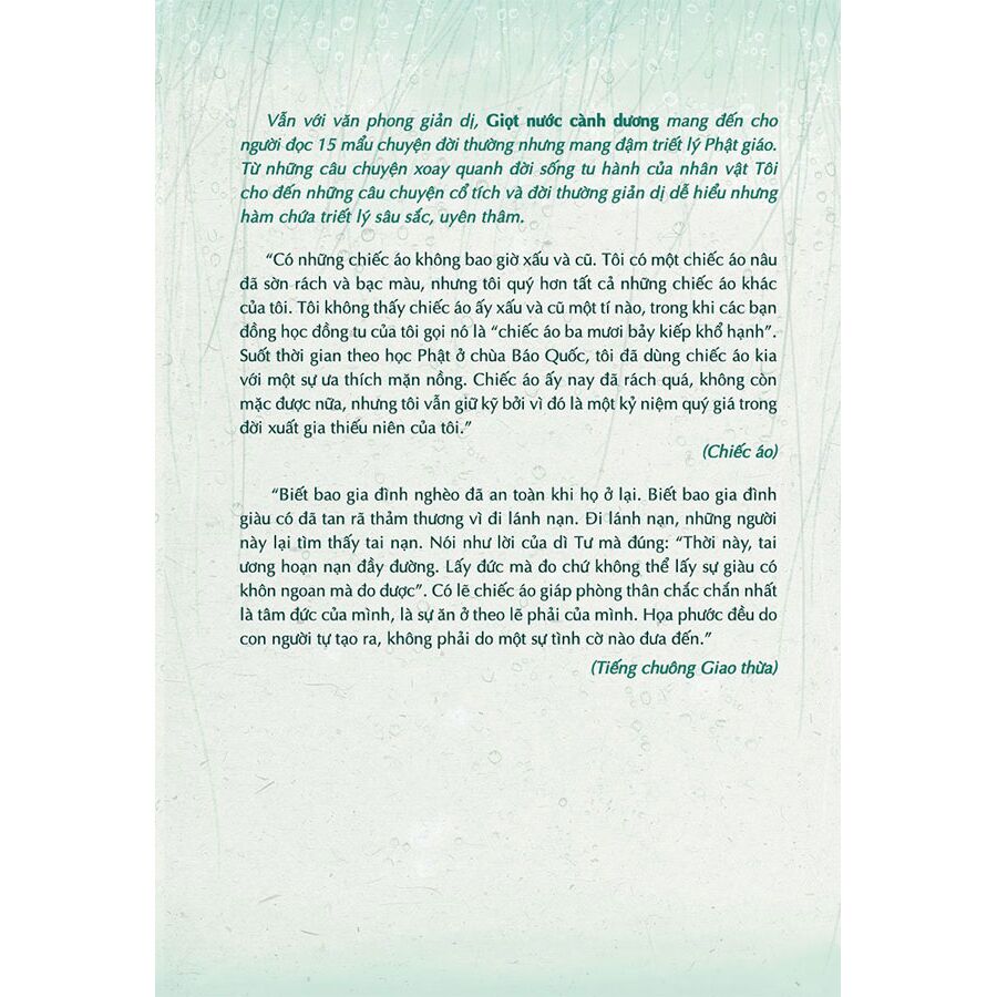 Vẫn với văn phong giản dị, Giọt Nước Cành Dương mang đến cho người đọc 15 mẩu chuyện đời thường nhưng mang đậm triết lý Phật giáo. Từ những câu chuyện xoay quanh đời sống tu hành của nhân vật Tôi cho ...