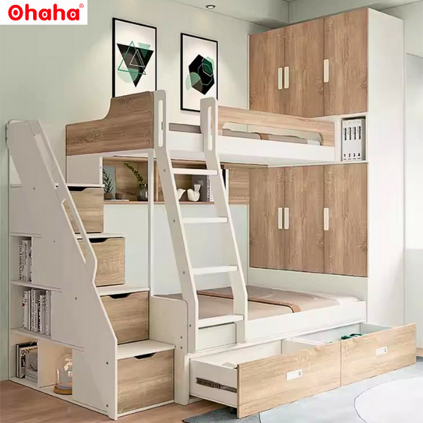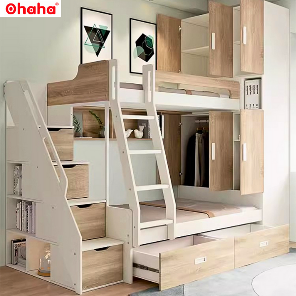 Giường tầng thông minh Ohaha kết hợp tủ áo và kệ sách - GTTM015 được thiết kế tiện dụng, tiết kiệm diện tích và chắc chắn, an toàn cho cả người lớn và trẻ nhỏ khi nằm. Đây là sự lựa chọn ưu việt cho không gian nội thất phòng ngủ nhỏ hẹp. Mẫu sản phẩm đầy đủ tiện nghi với nhiều không gian lưu trữ đồ đạc: tủ quần áo, hộc cầu thang, kệ sách,