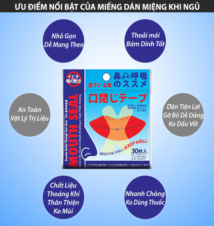 Thở bằng miệng khi ngủ là 1 tật xấu gây ảnh hưởng đến sức khỏe, hoạt động của phổi, giảm nồng độ oxy trong máu, viêm họng, bệnh lý về răng miệng Nó còn gây ảnh hưởng về mặt thẩm mỹ như hô hàm trên, cằm lẹm Google với từ khoá thở bằng miệng khi ngủ bạn sẽ thấy nhiều thông tin nói về tác hại của thói quen này Miếng dán miệng khi ngủ MOUTH SEAL chính là giải pháp - giúp bạn có thể khép miệng lại khi ngủ, giúp giảm tình trạng khô cổ họng, giảm ngáy do thở bằng miệng, quan trọng nhất là tạo dần thói quen thở bằng mũi tốt cho sức khoẻ & thẩm mỹ ĐẶC ĐIỂM NỔI BẬT:
