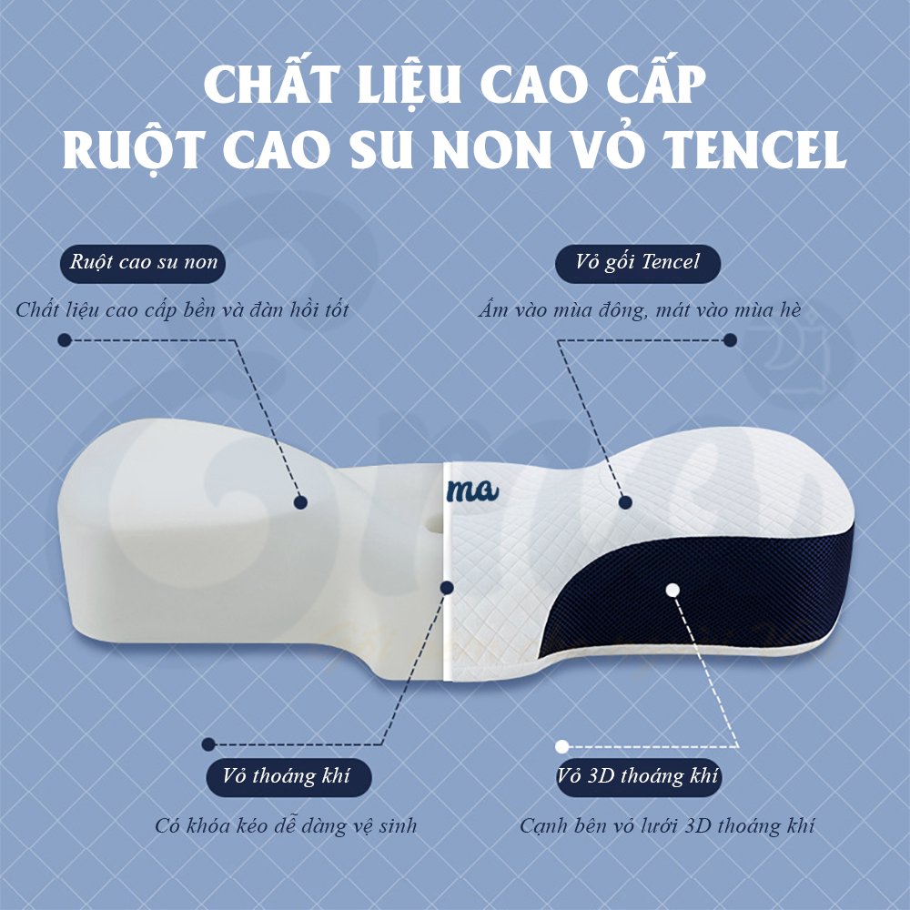 - Chất liệu cao cấp với ruột gối làm từ Cao su non (Memory Foam) và vỏ gối làm từ vải sinh học Tencel