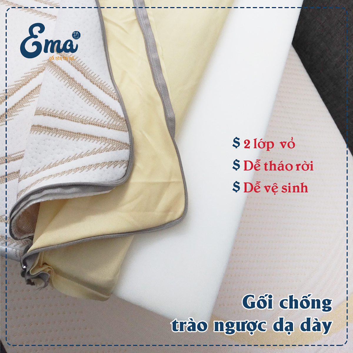 GỐI CHỐNG TRÀO NGƯỢC CHO NGƯỜI VIỆT Với mong muốn mỗi người trào ngược Việt Nam đều có thể dùng gối nêm - Gối chống trào ngược Ema được sản xuất hoàn toàn tại Việt Nam