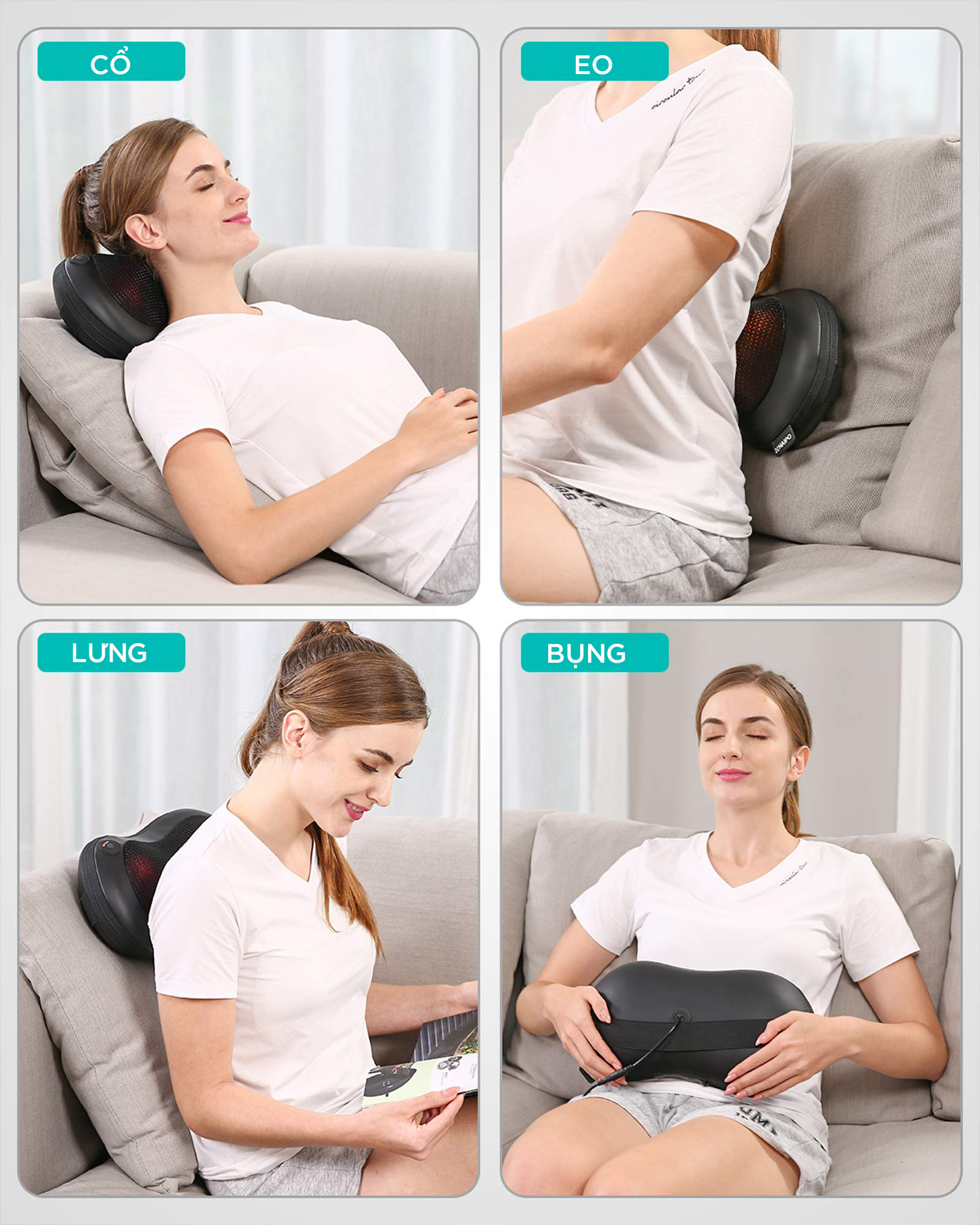 - GIẢM ĐAU VAI, CỔ, LƯNG: Gối massage đa năng với phương pháp xoa bóp sâu, nhỏ gọn vừa vặn với các đường cong cơ thể. Mát xa toàn thân từ trên cổ, lưng dưới và lưng trên, bụng, bắp chân, đùi và hơn thế nữa, mang lại cho bạn hiệu quả massage thư giãn toàn thân.