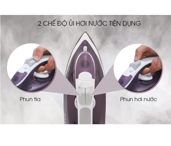 - Chế độ ủi khô, ủi hơi nước tiện dụng: Trong chế độ ủi hơi nước có chế độ phun hơi, phun tia tạo ra luồng hơi nước mạnh mẽ, làm thẳng các nếp nhăn nhanh chóng. Ngoài ra, bàn là còn có chế độ phun hơi thẳng đứng ủi quần áo treo trên móc dễ dàng.