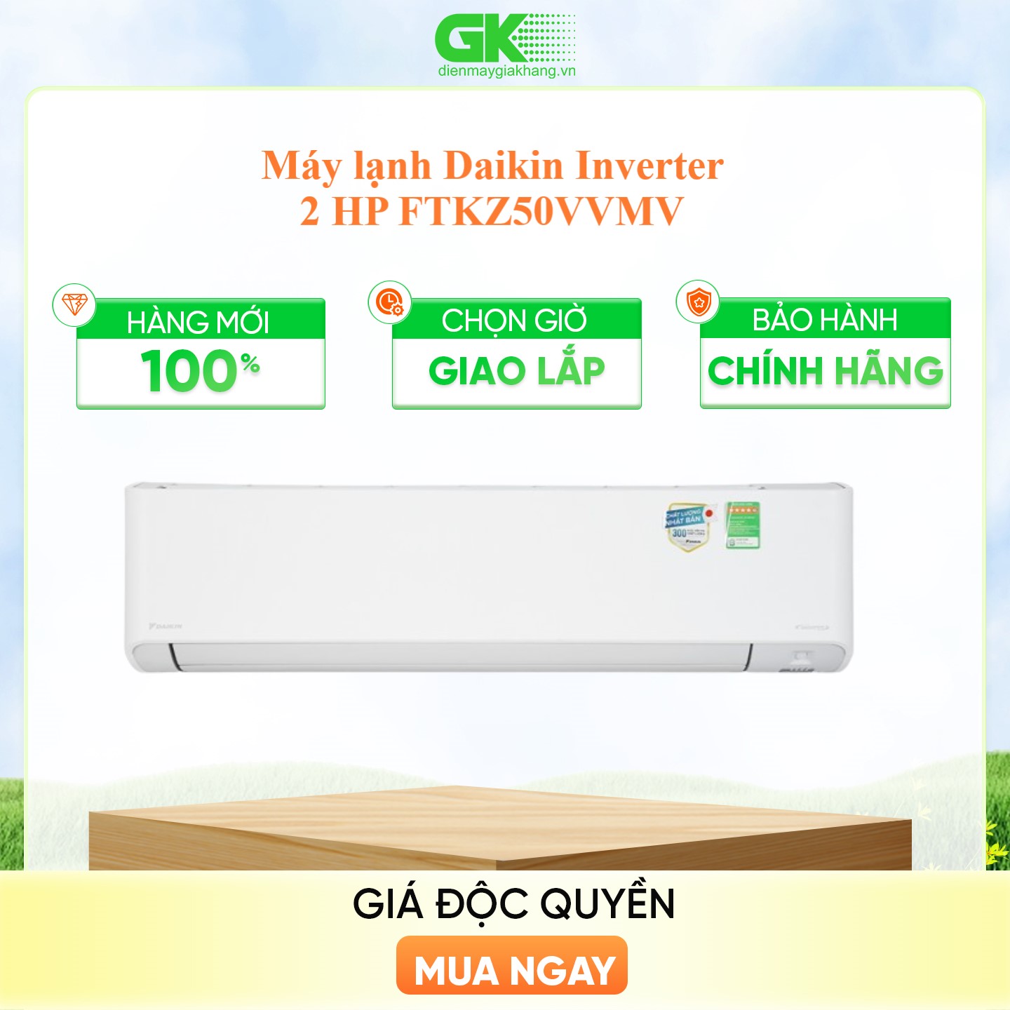 LƯU Ý: ● ĐƠN HÀNG KHÁCH Ở HỒ CHÍ MINH --- SHOP GIAO MIỄN PHÍ (TRỪ CẦN GIỜ). ● Thông số kỹ thuật Máy lạnh Daikin Inverter 2 HP FTKB50ZVMV - Thông tin sản phẩm - Loại máy:1 chiều (chỉ làm lạnh) - Inverter:Có Inverter - Công suất làm lạnh:2 HP - 18.100 BTU - Phạm vi làm lạnh hiệu quả:Từ 20 - 30m² (từ 60 đến 80m³) - Độ ồn trung bình (được đo trong phòng thí nghiệm):Dàn lạnh: 25 - 44 dB - Dàn nóng: 43 - 49 dB - Dòng sản phẩm:2025 - Sản xuất tại:Việt Nam - Thời gian bảo hành cục lạnh, cục nóng:1 năm - Thời gian bảo hành máy nén:5 năm - Chất liệu dàn tản nhiệt:Ống dẫn gas bằng Đồng - Lá tản nhiệt bằng Nhôm phủ sơn tĩnh điện - Loại Gas:R-32 Mức tiêu thụ điện năng - Tiêu thụ điện:1.85 kWh - Nhãn năng lượng:5 sao (Hiệu suất năng lượng 5.20) - Công nghệ tiết kiệm điện:Inverter